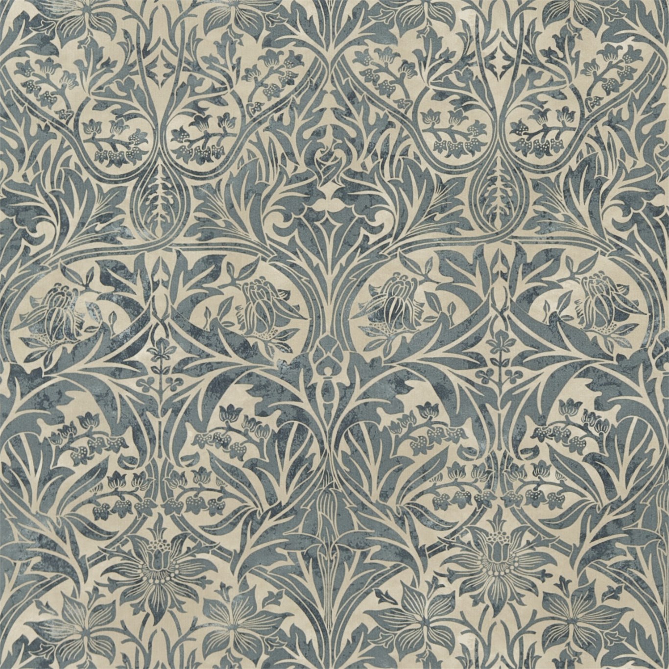 Description: A blue and white wallpaper with a design on it's side and a bird on the wall.