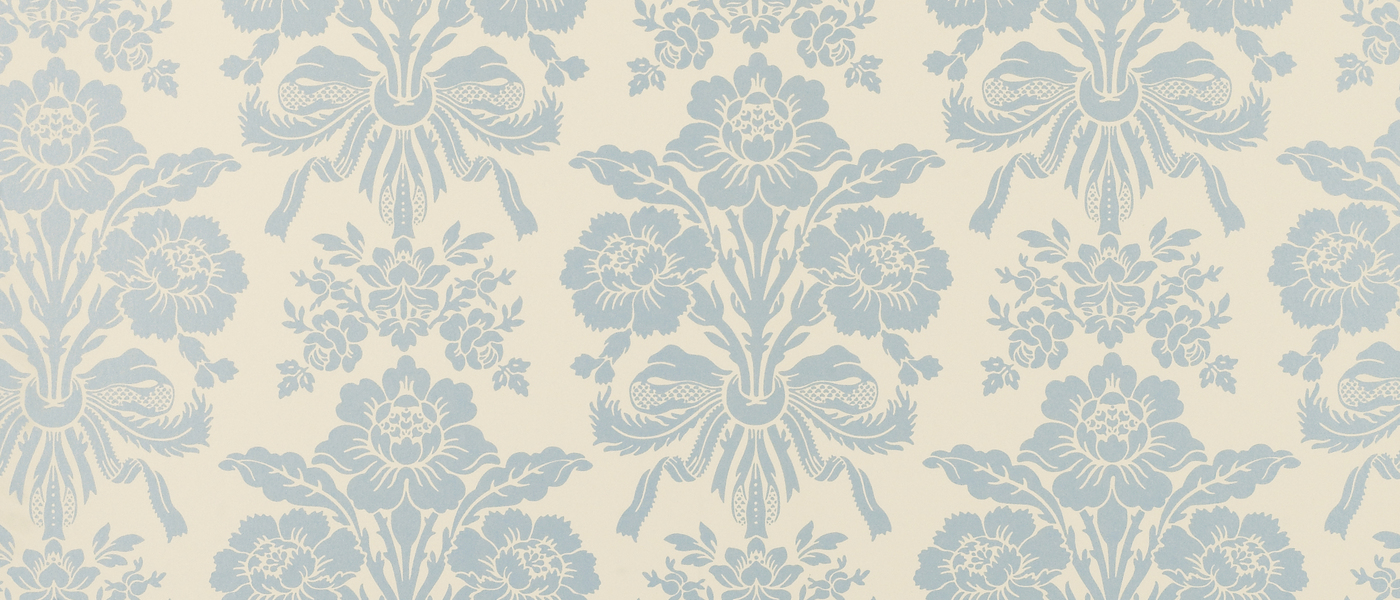 Description: A blue and white wallpaper with a floral design on it's side and a white background with a blue flower.
