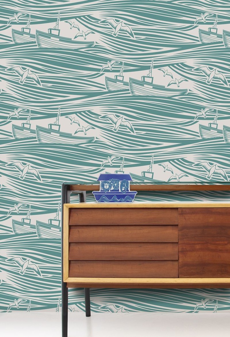 Description: A blue and white wallpaper with a wooden cabinet and a blue vase on top of it with a blue boat on it.