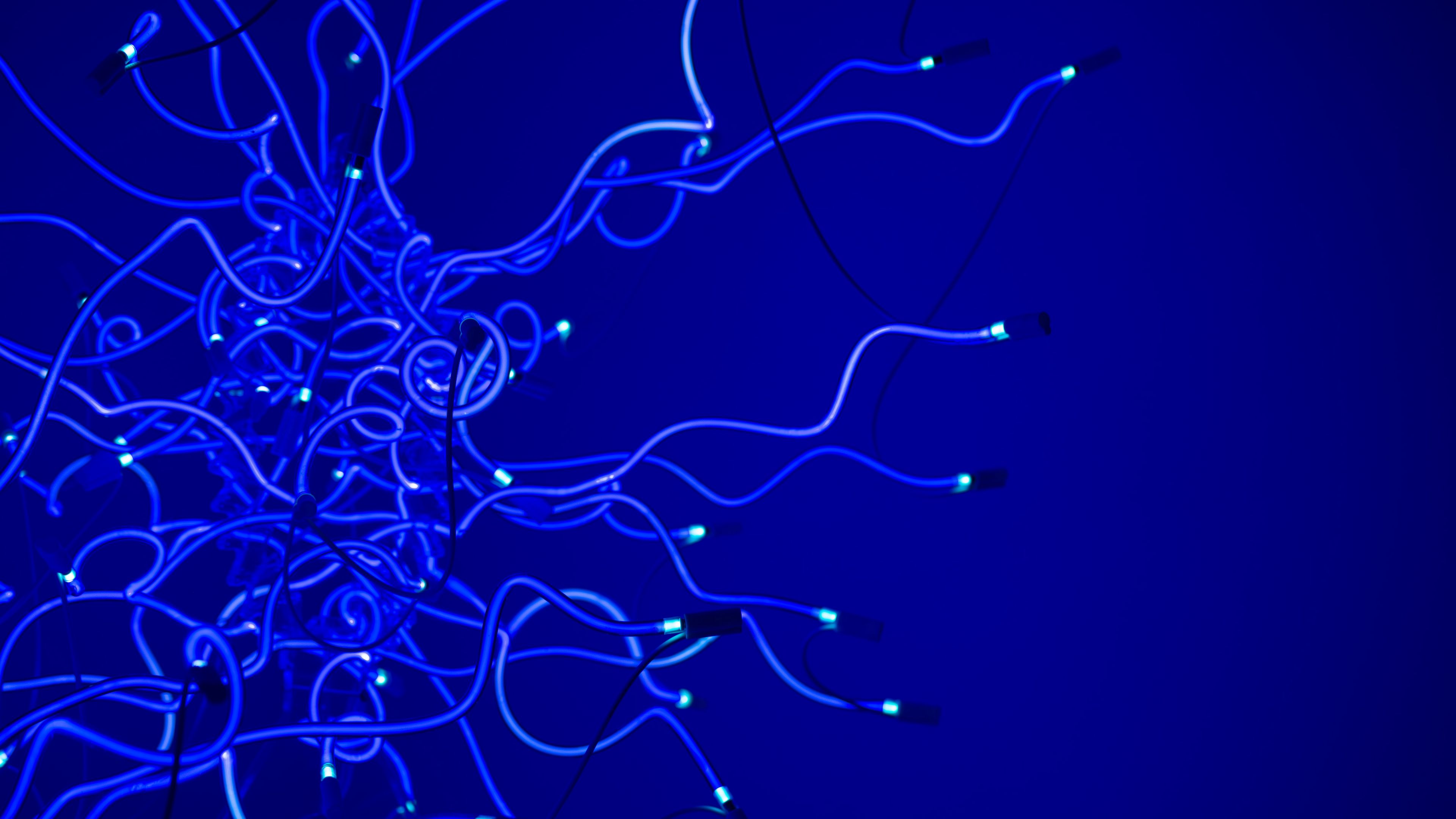 Description: A blue background with a bunch of wires and lights in the middle of it and a clock on the wall.