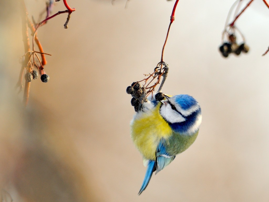 Description: A blue and yellow bird hanging from a branch with berries on it's side and a seed hanging from the branch.