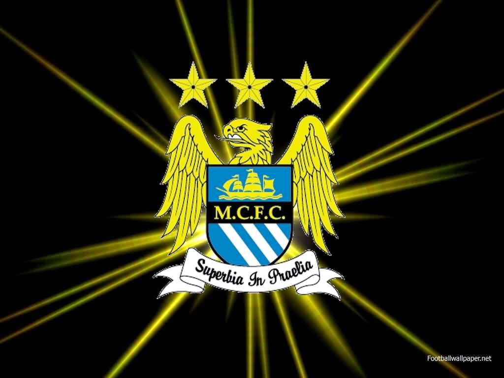 Description: A blue and yellow emblem with stars on it and a ribbon around it that says mcfc.