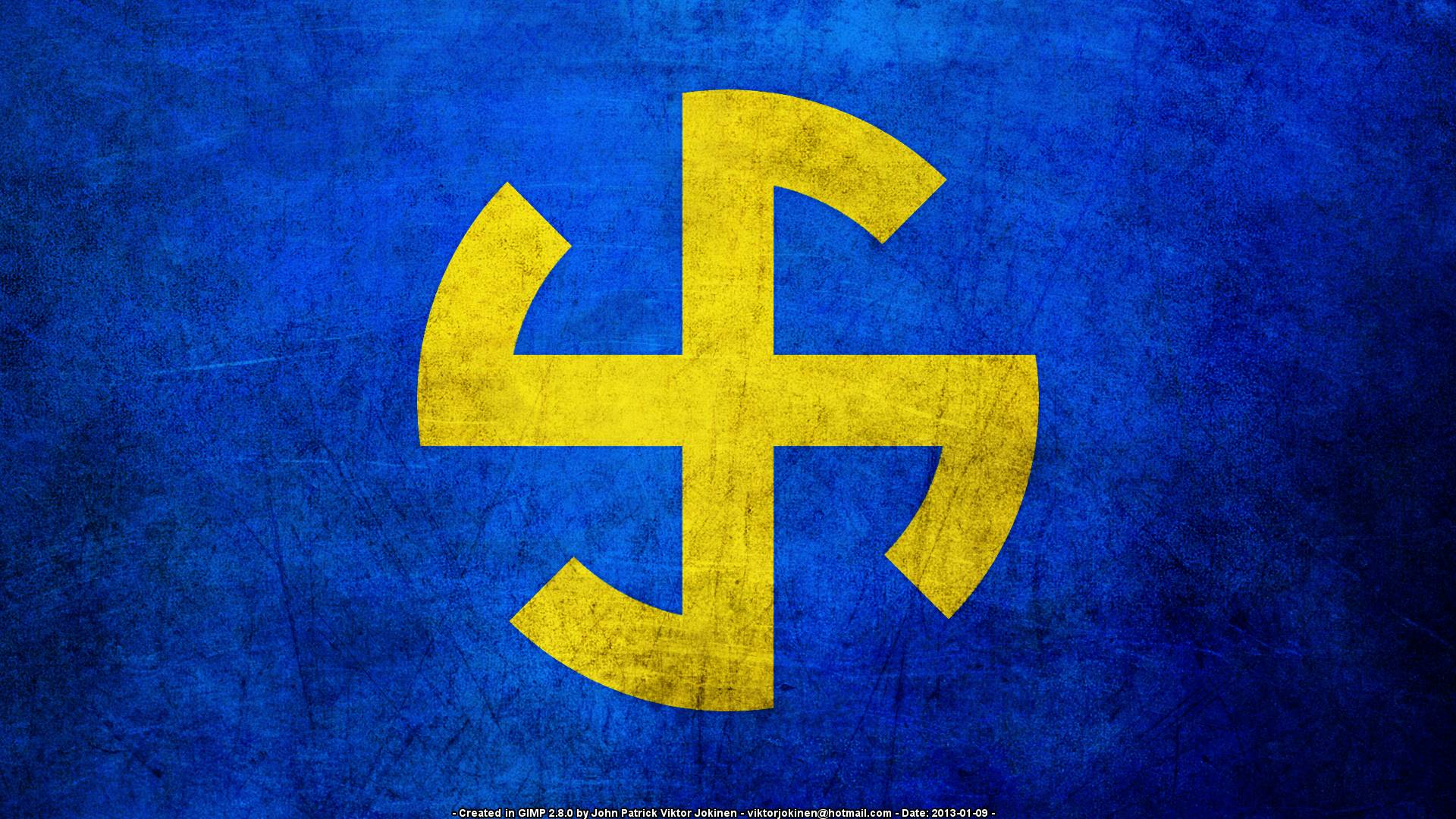 Description: A blue and yellow flag with a yellow cross on it's side and a black cross on the bottom of the flag.