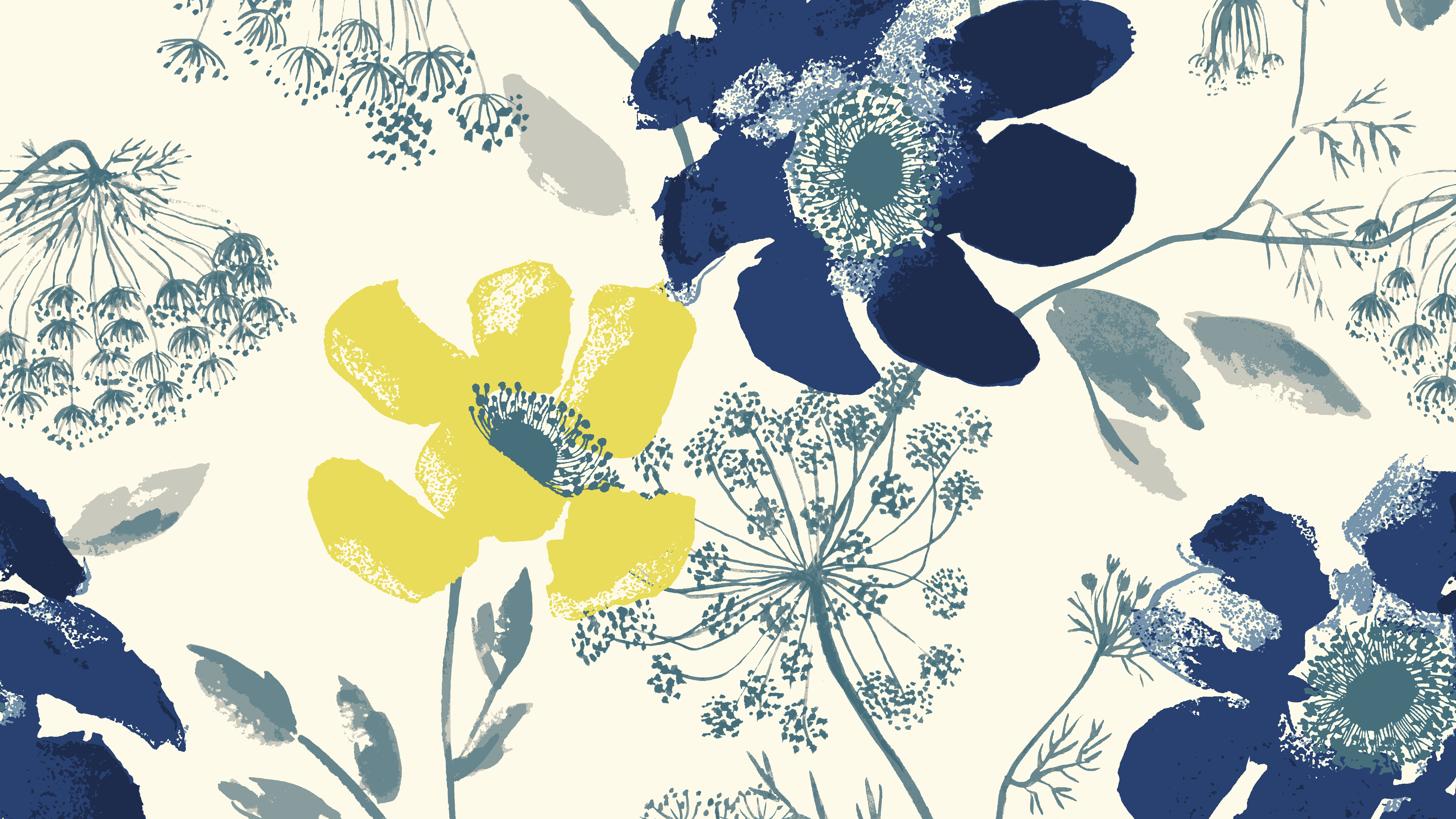 Description: A blue and yellow flower pattern on a white background with blue and yellow flowers on it.