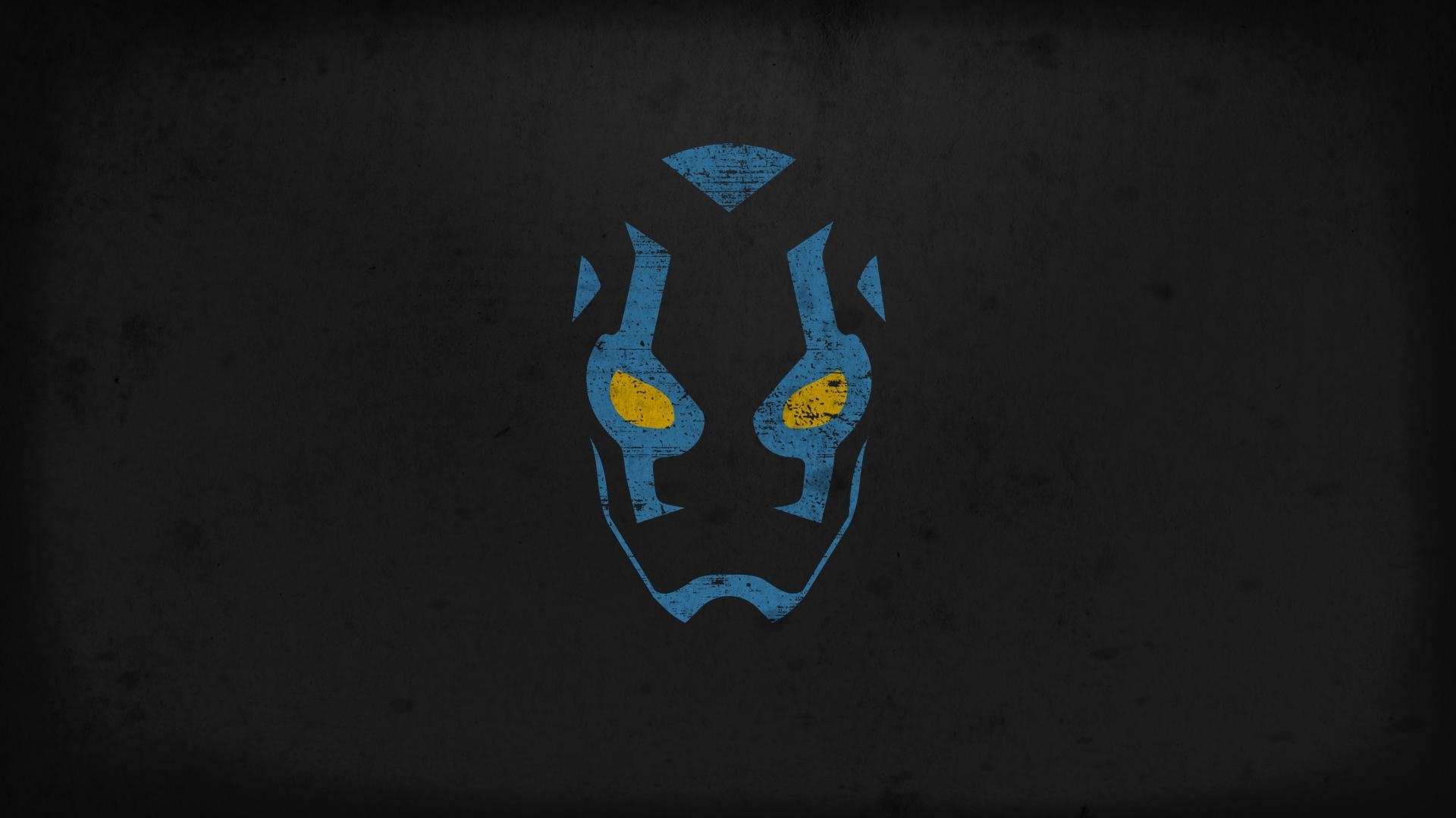 Description: A blue and yellow mask with yellow eyes on a black background with a black background and a blue and yellow mask.
