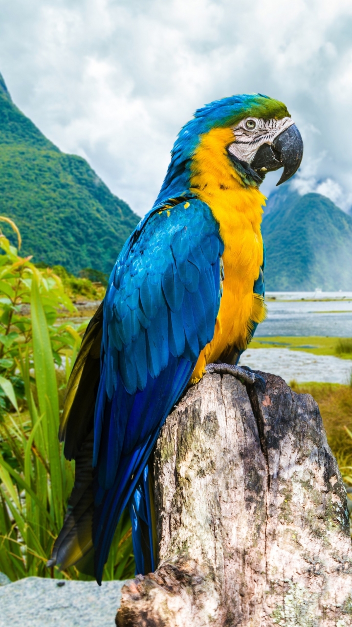 Description: A blue and yellow parrot sitting on a tree stump in a field of grass and mountains in the background.