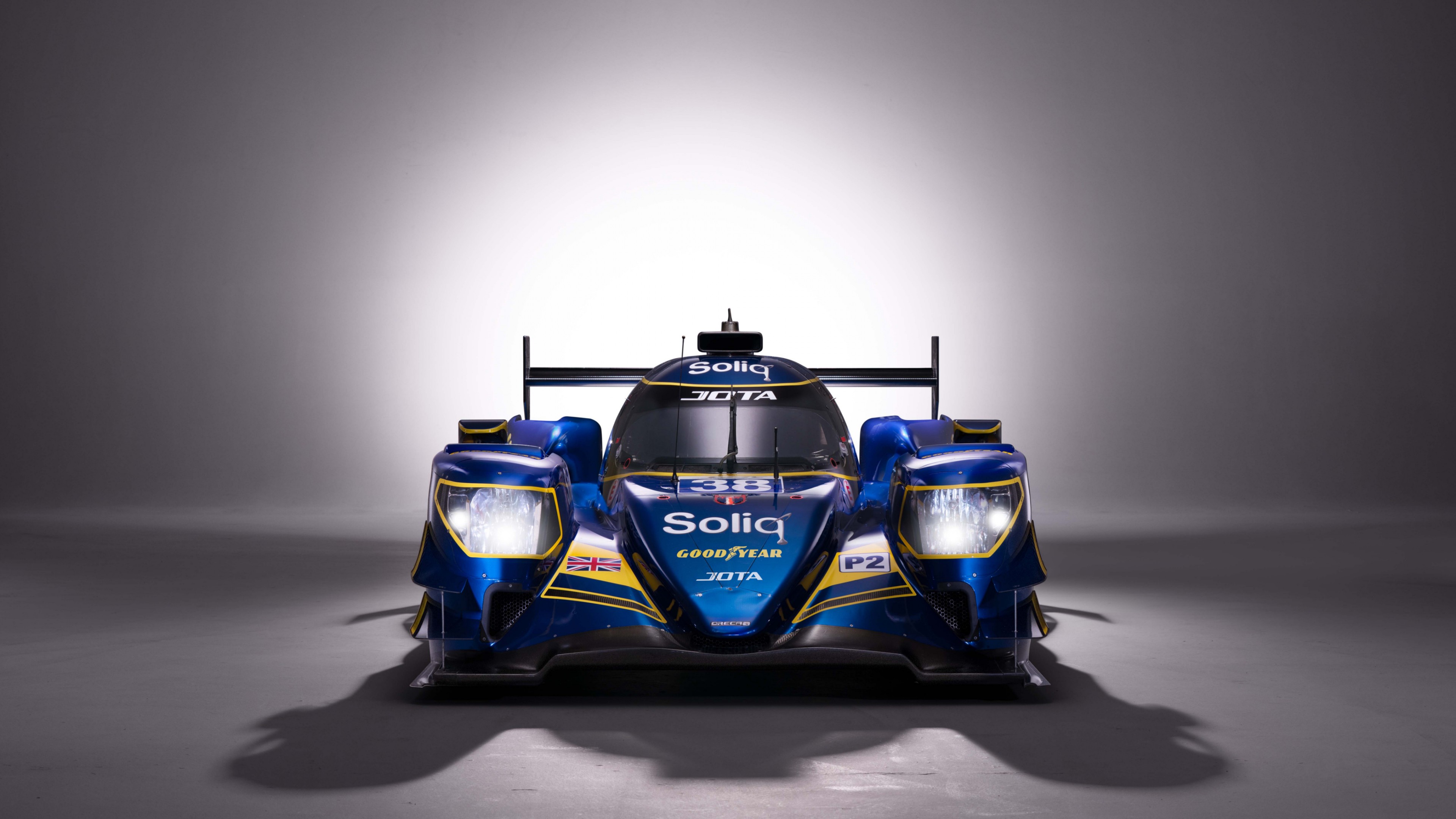 Description: A blue and yellow race car with a white background and a shadow of a person on the side of the car.