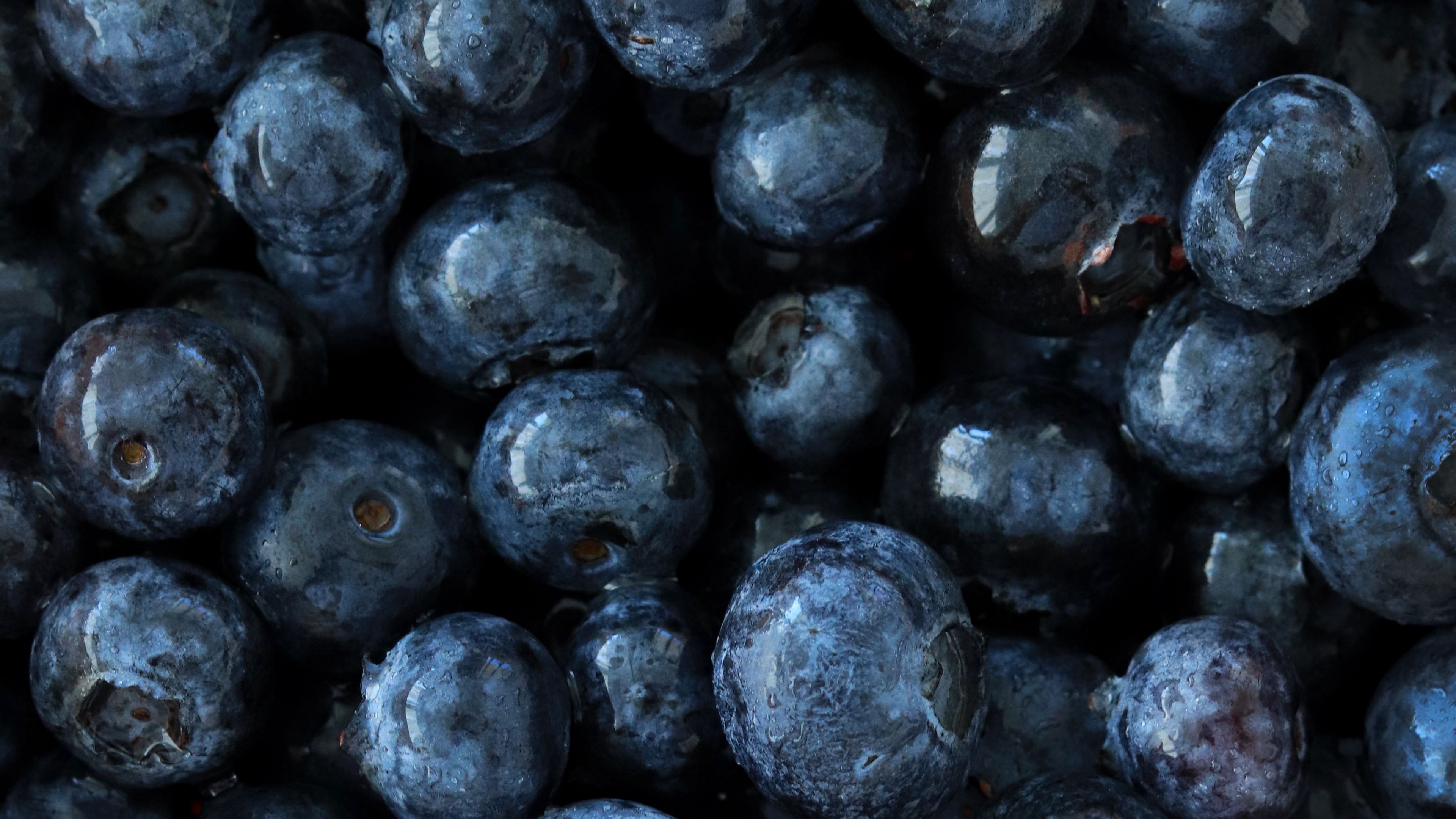 Description: A close up of a bunch of blueberries with some brown spots on them and some black spots on the top of the berries.