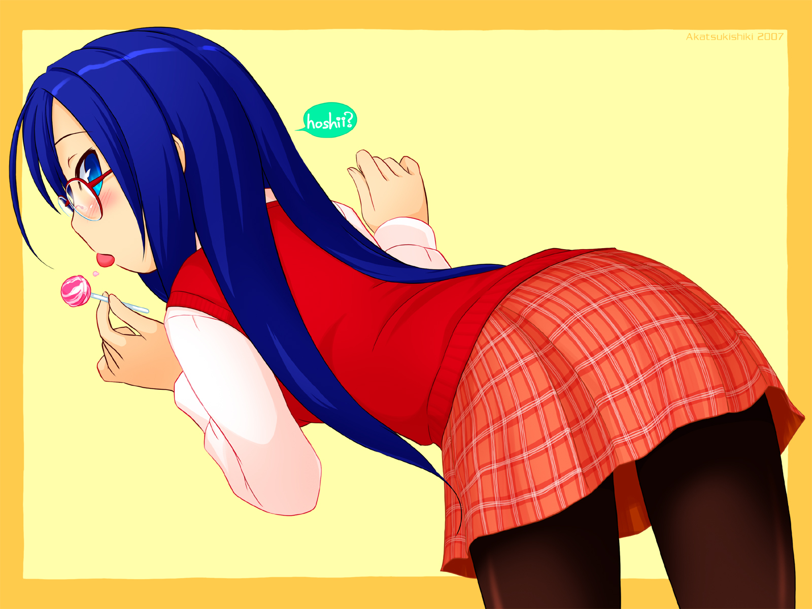 Description: A girl with blue hair and a red shirt is leaning on a wall and looking at something with a bubble.