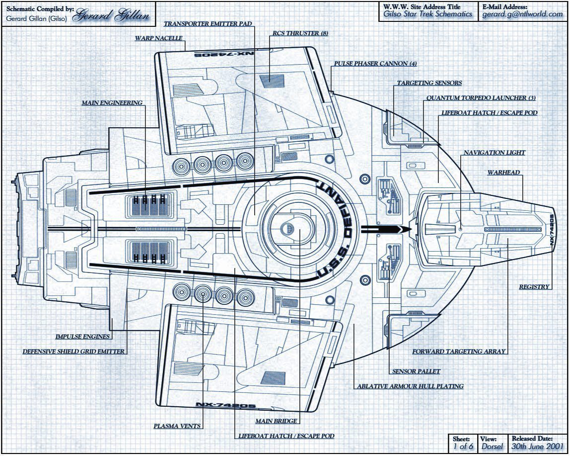 Description: A blueprint of a space ship with a diagram of the parts labeled below it and a description of the parts labeled below.