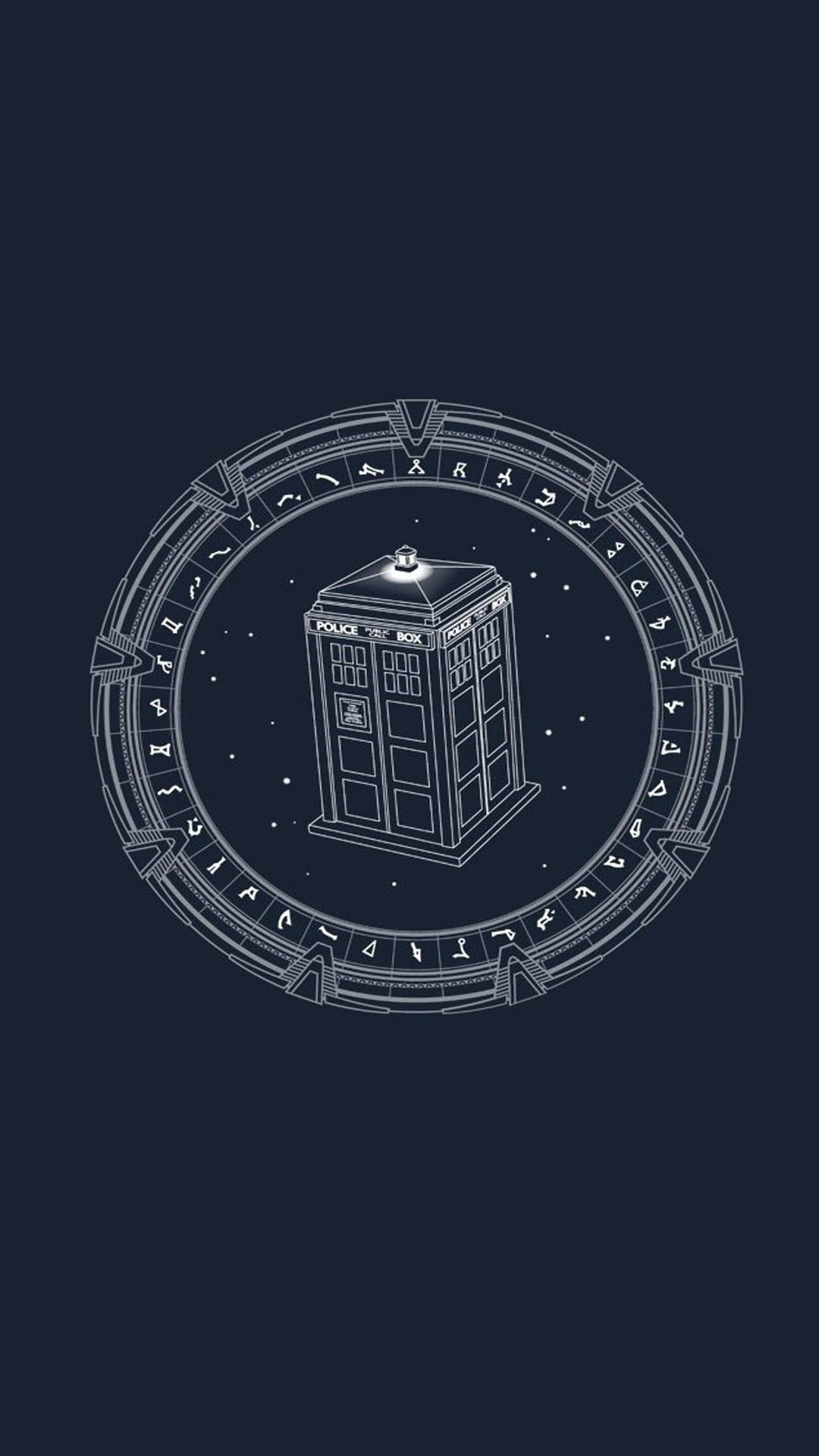 Description: A blueprinted tardish in a circle with a star on it and a clock on top.