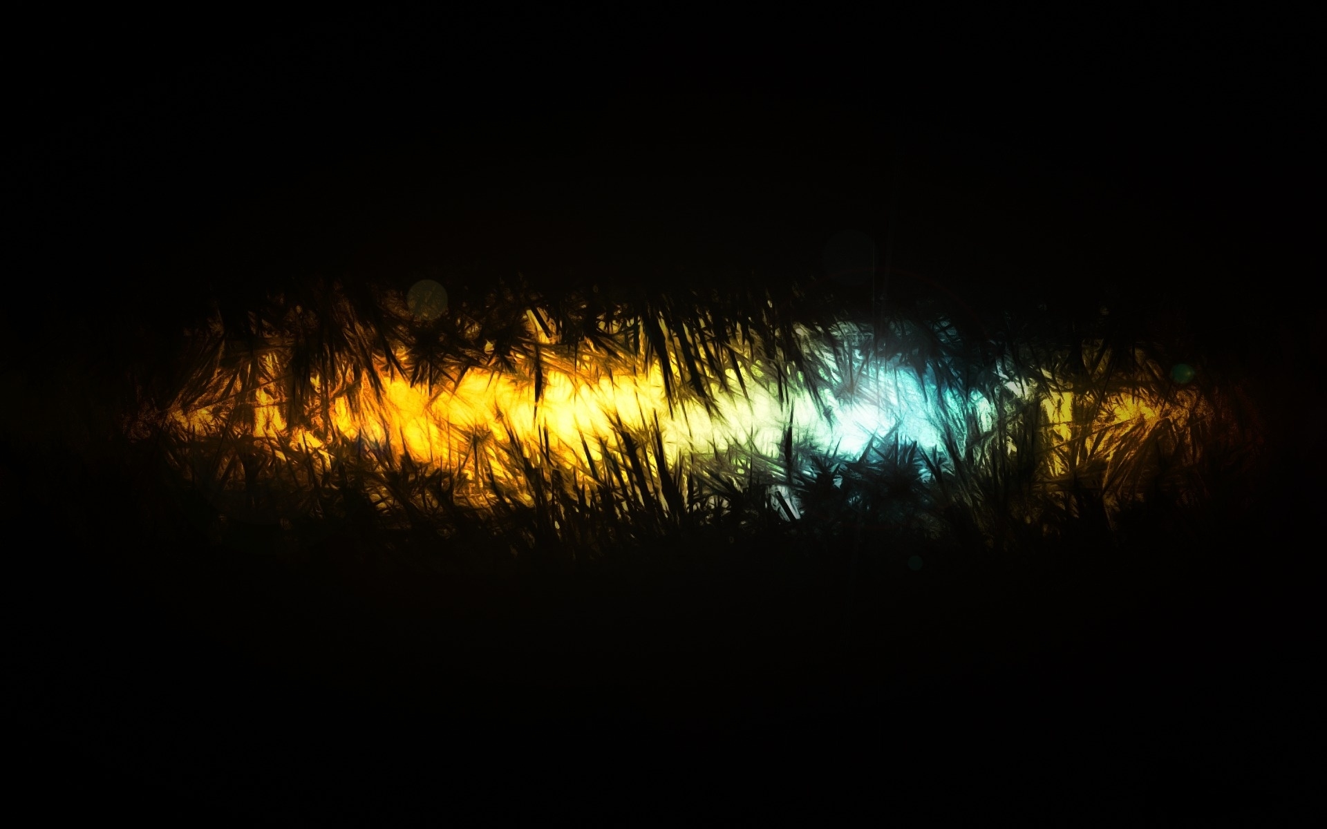 Description: A blurry image of a field with grass and trees in the background at night time with a bright light.