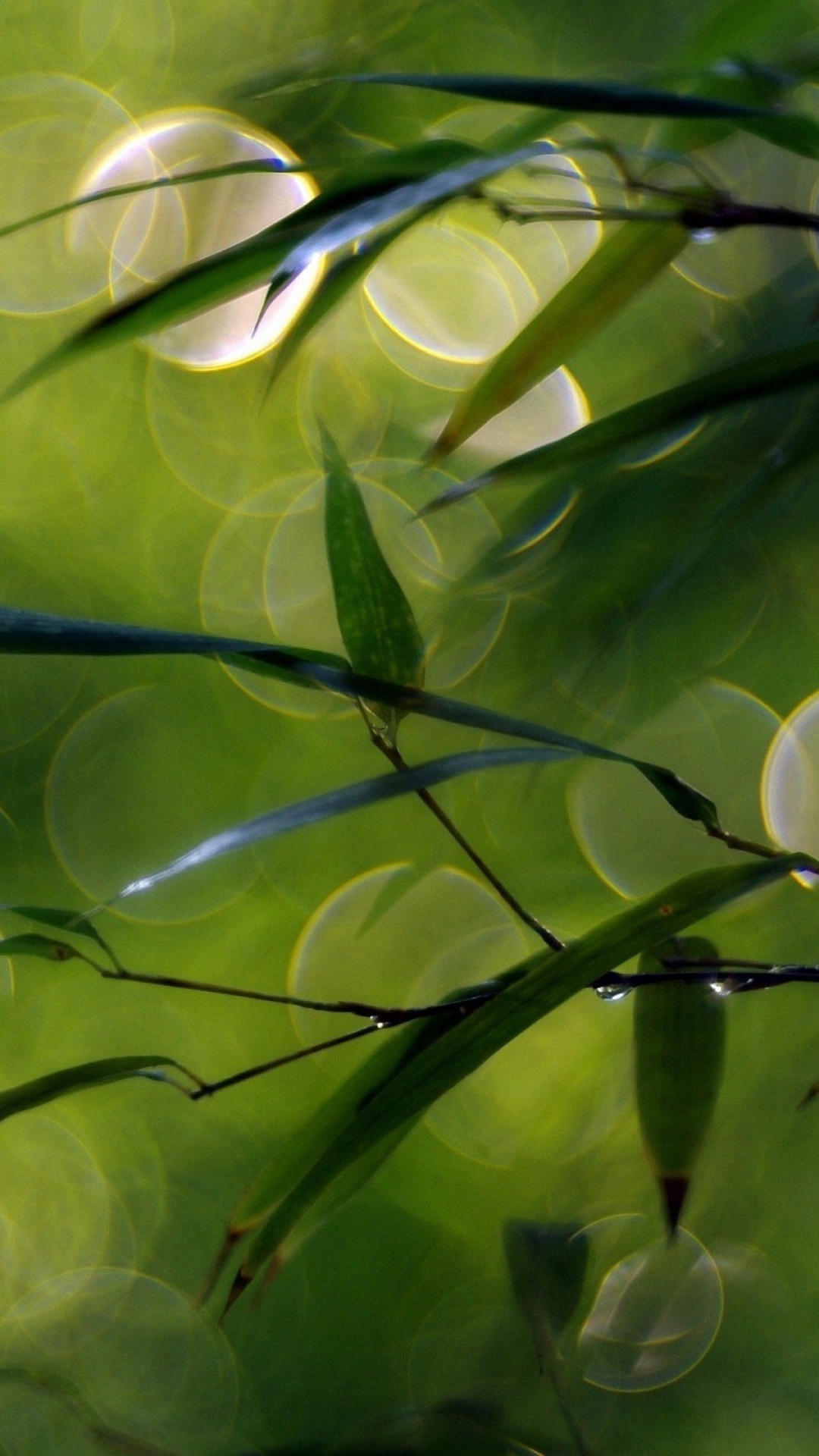 Description: A blurry photo of a green plant with leaves and water droplets on it's leaves and stems.