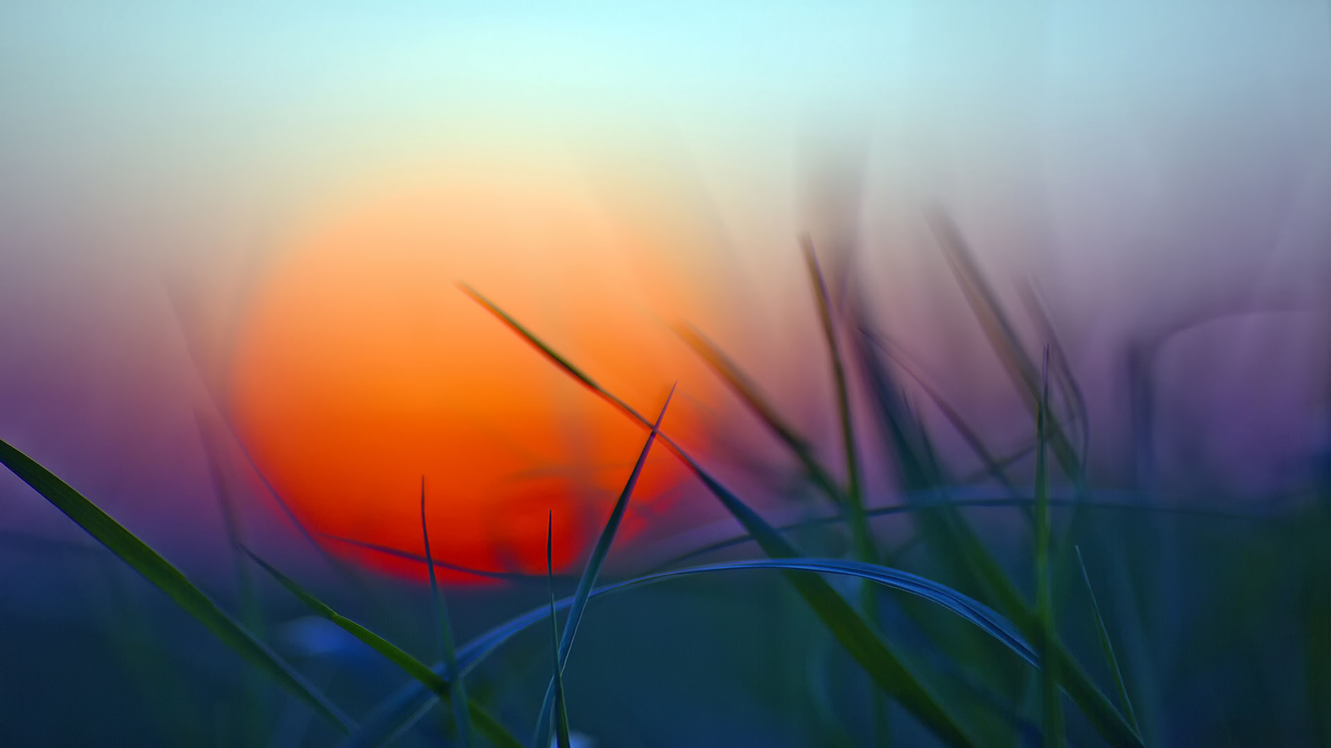 Description: A blurry photo of a sunset with grass in the foreground and a blurry background of the sun.