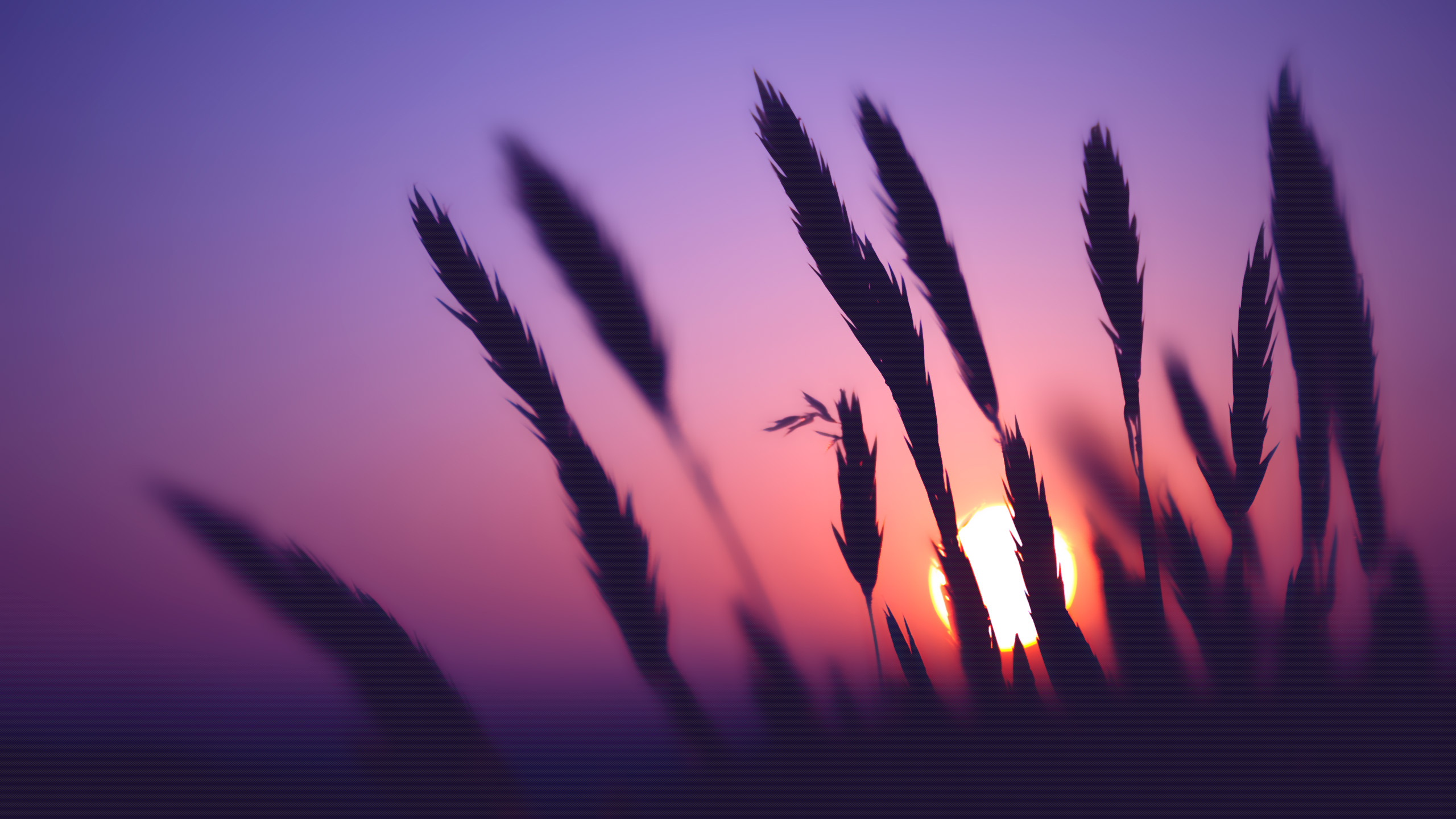 Description: A blurry photo of a sunset with a few tall grass in the foreground and a purple sky in the background.
