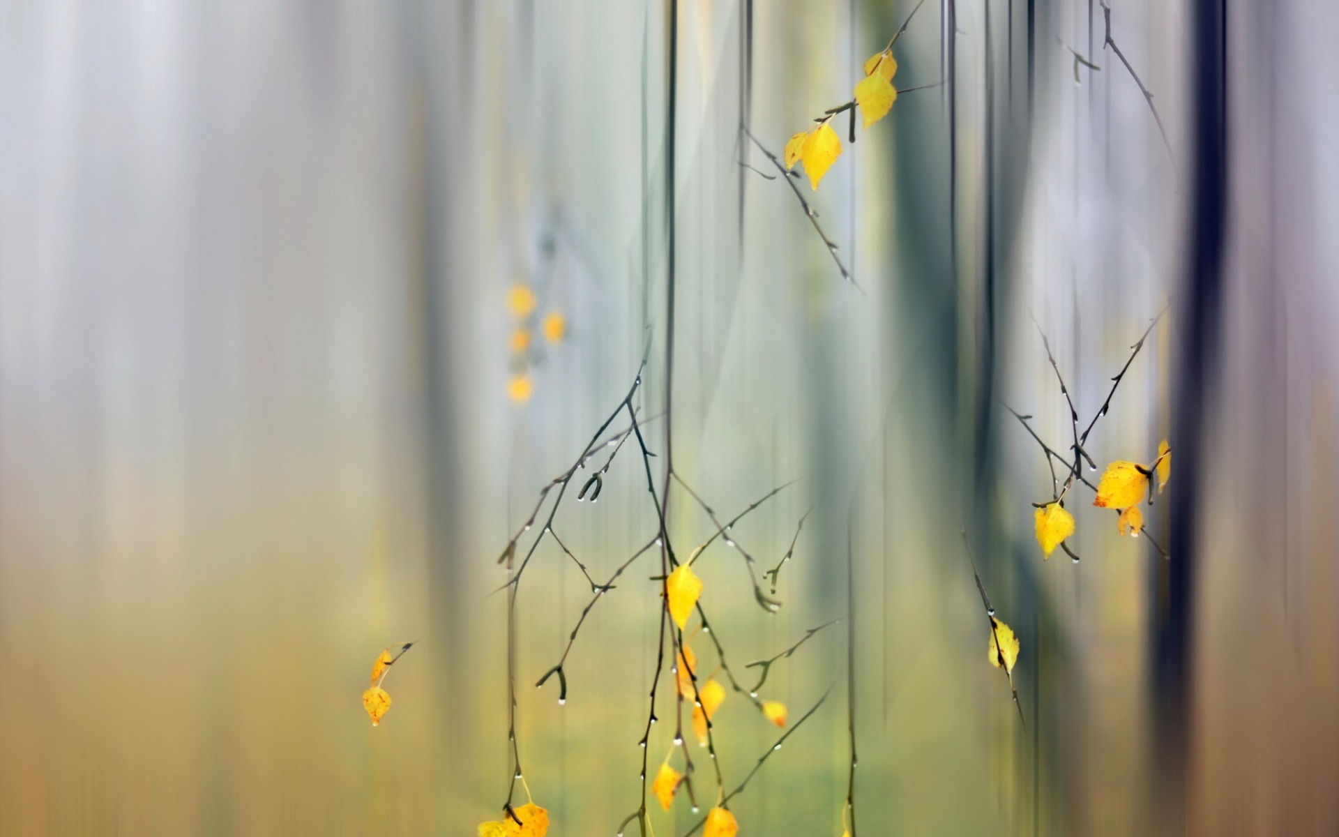 Description: A blurry photo of a tree with yellow leaves on it's branches and a blurry background.