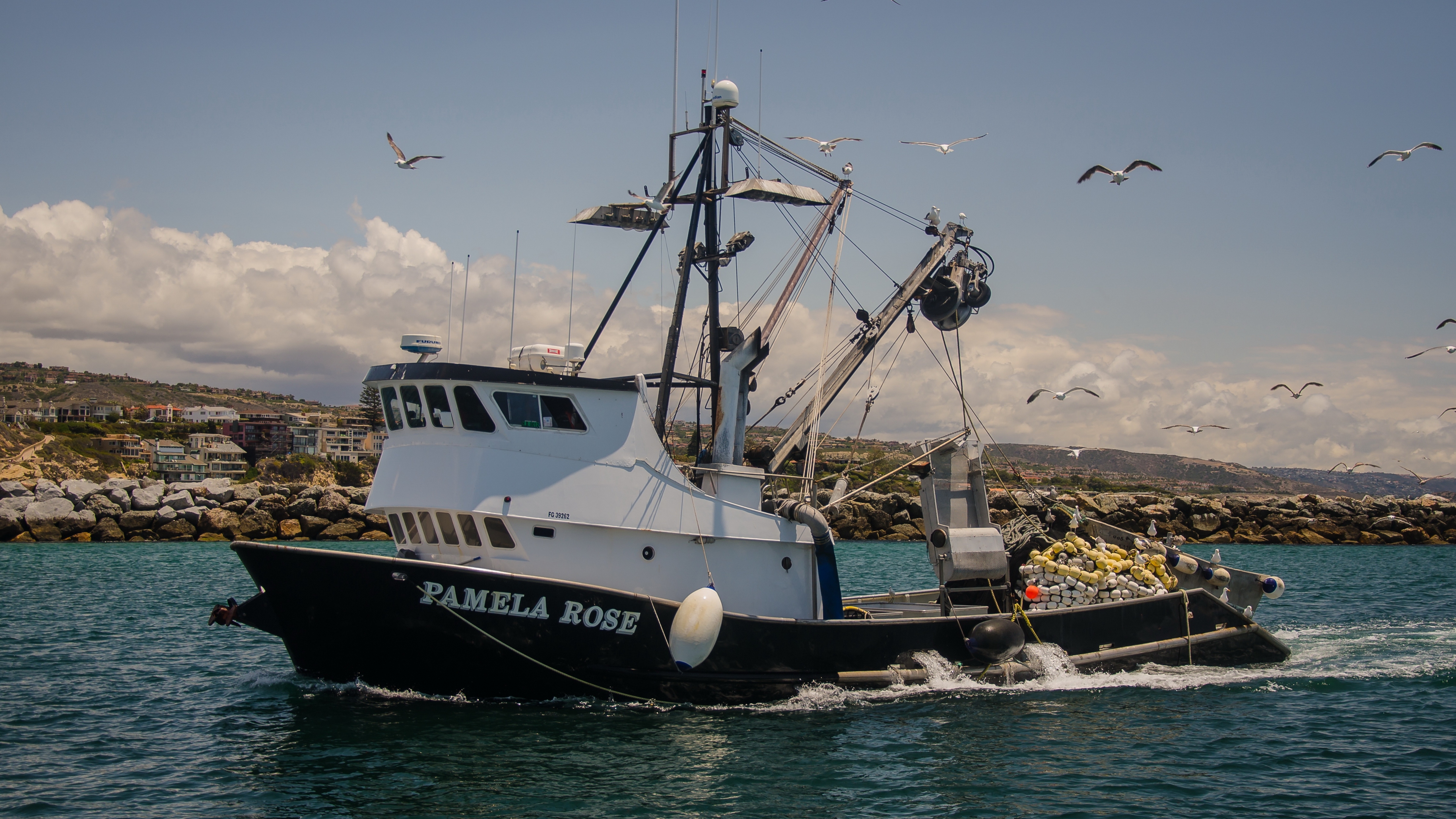 Description: A boat with a bunch of birds flying around it in the water near a shore line with houses and a hill.