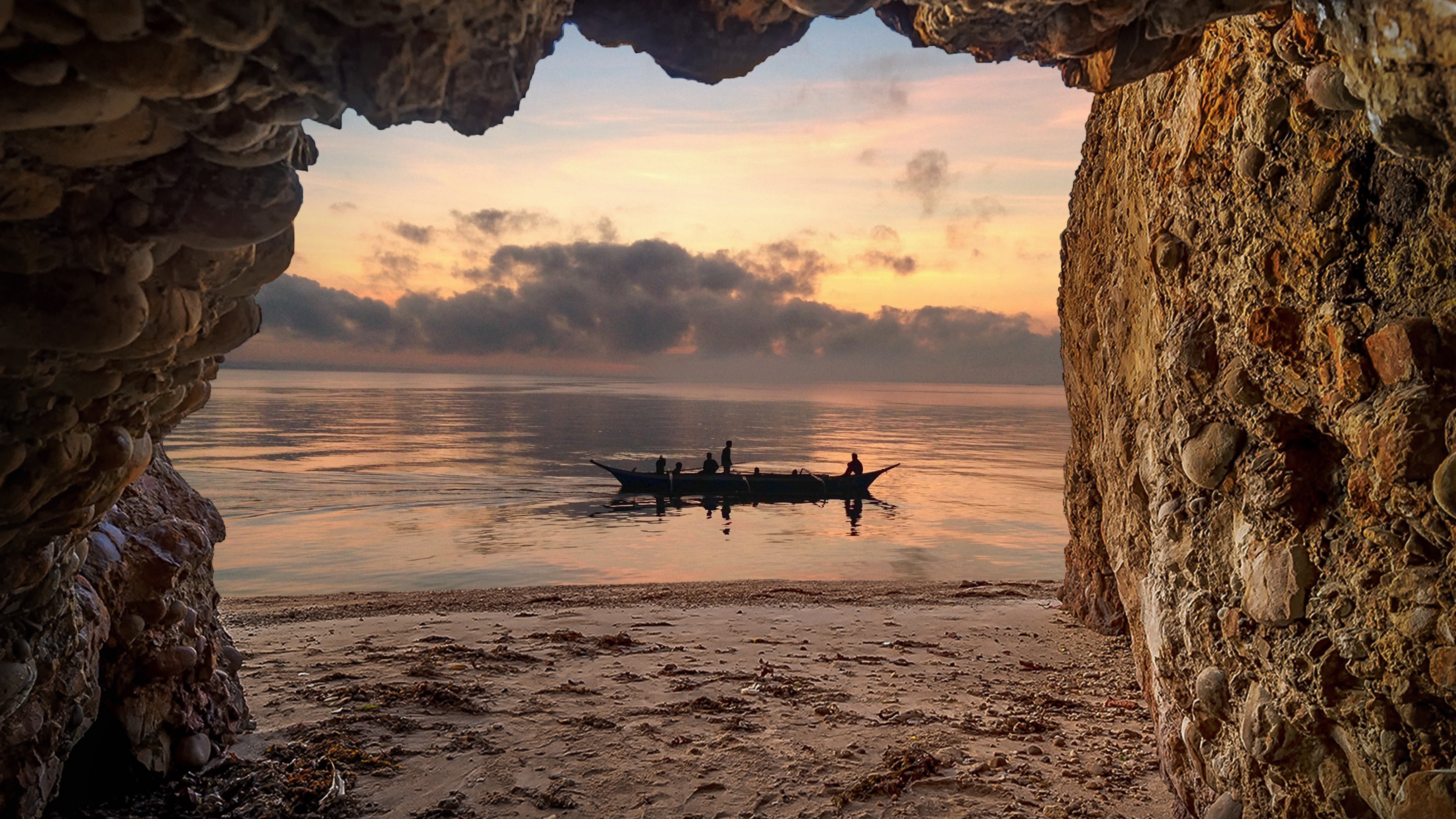 Description: A boat is in the water near a cave with a sunset in the background and a person in the boat.