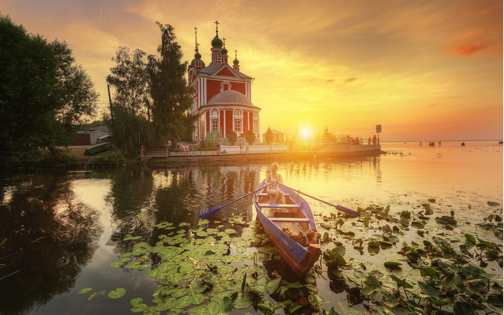 Description: A boat is sitting in the water near a church and a dock with lily pads on the water and a sunset in the background.