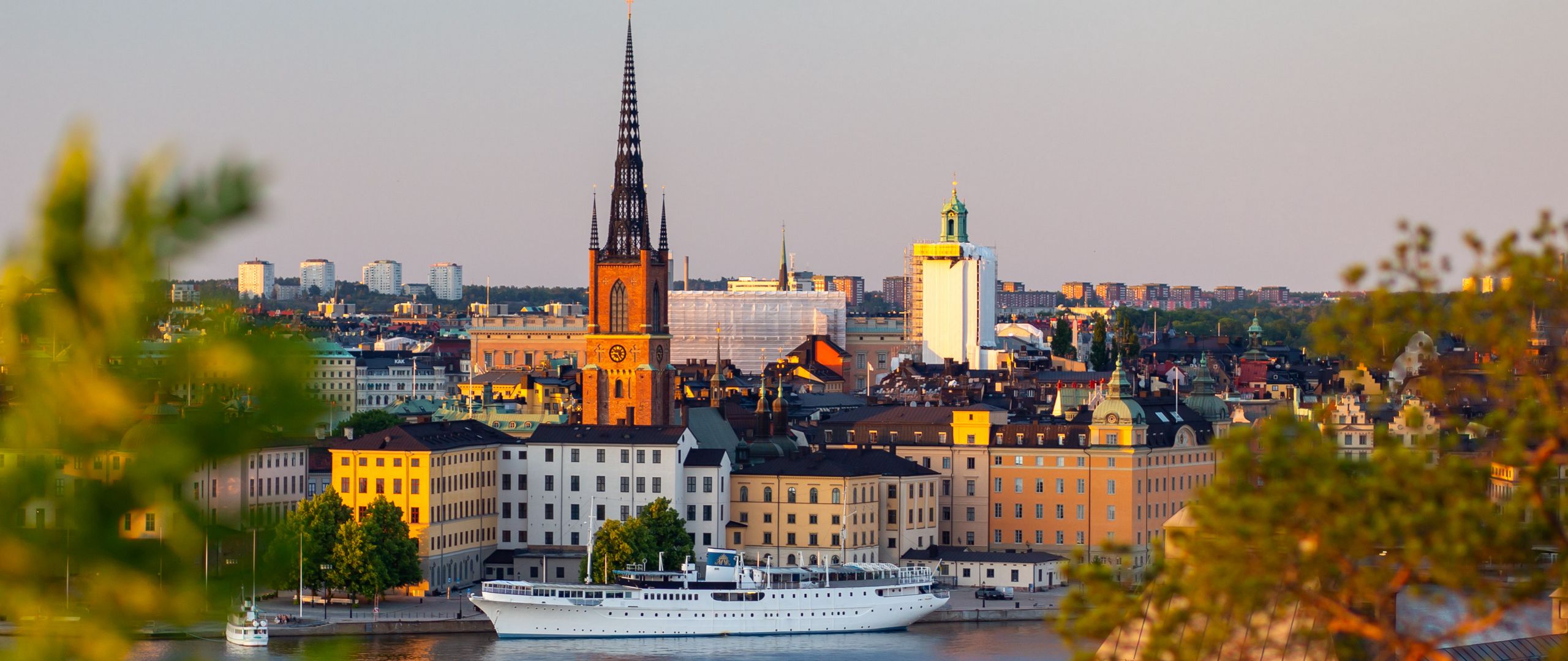 Description: A boat is in the water near a city with tall buildings and a spire in the background.