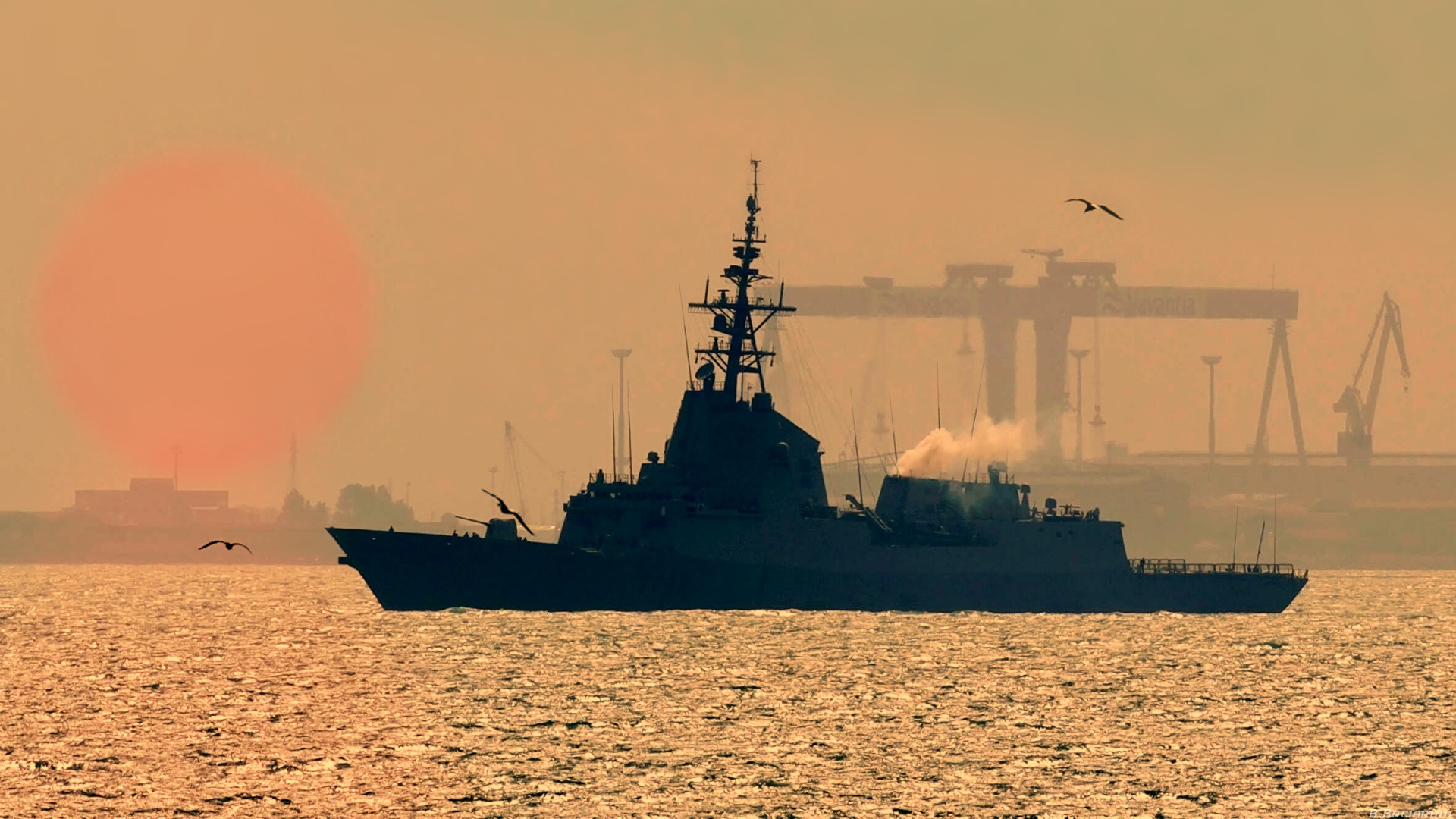 Description: A large boat floating on top of a body of water near a large crane crane in the distance with a sunset in the background.