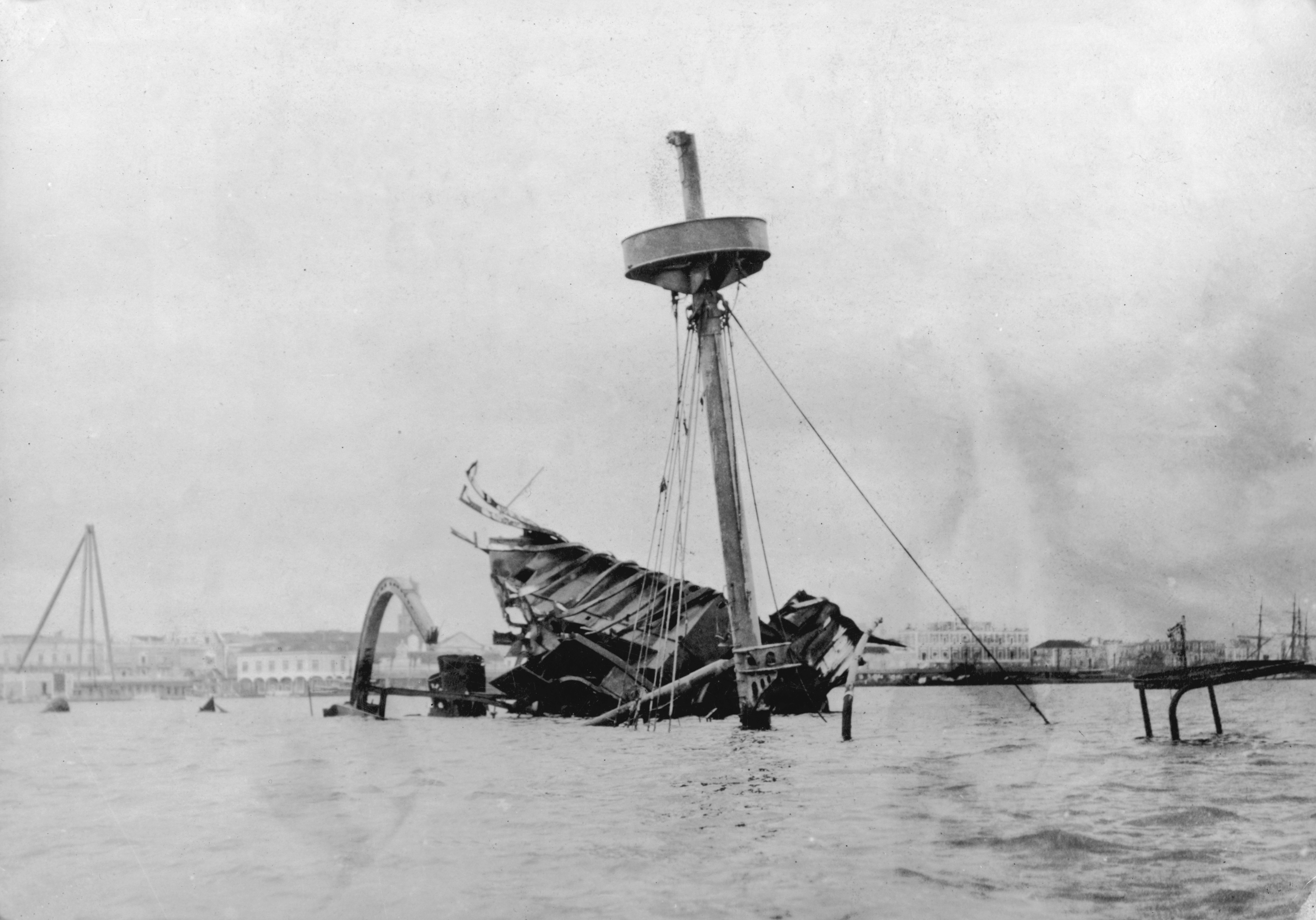 Description: A boat that is sitting in the water near a dock and a crane in the background with a building in the background.