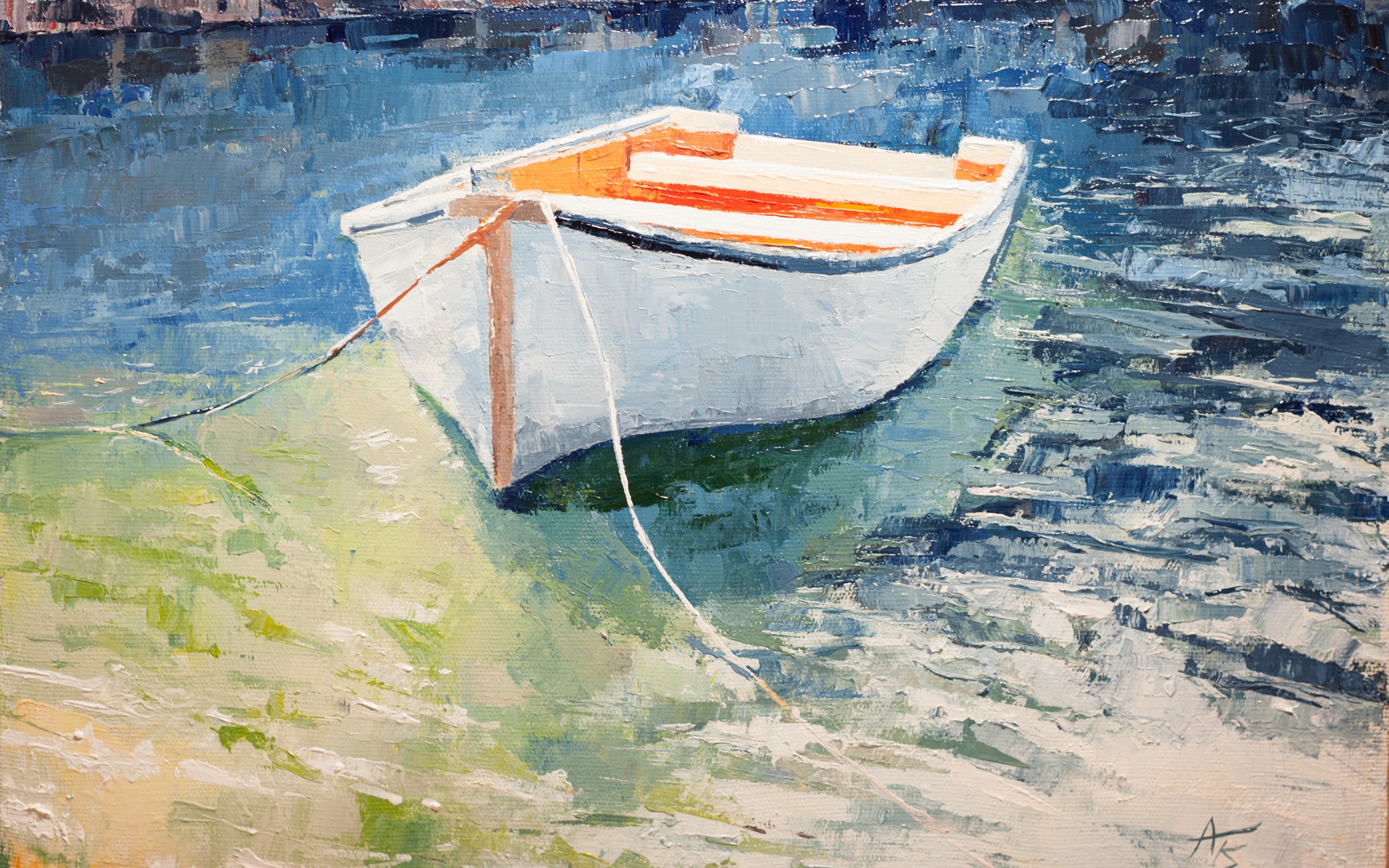 Description: A painting of a boat tied to a dock on the water with a rope attached to it's hull.
