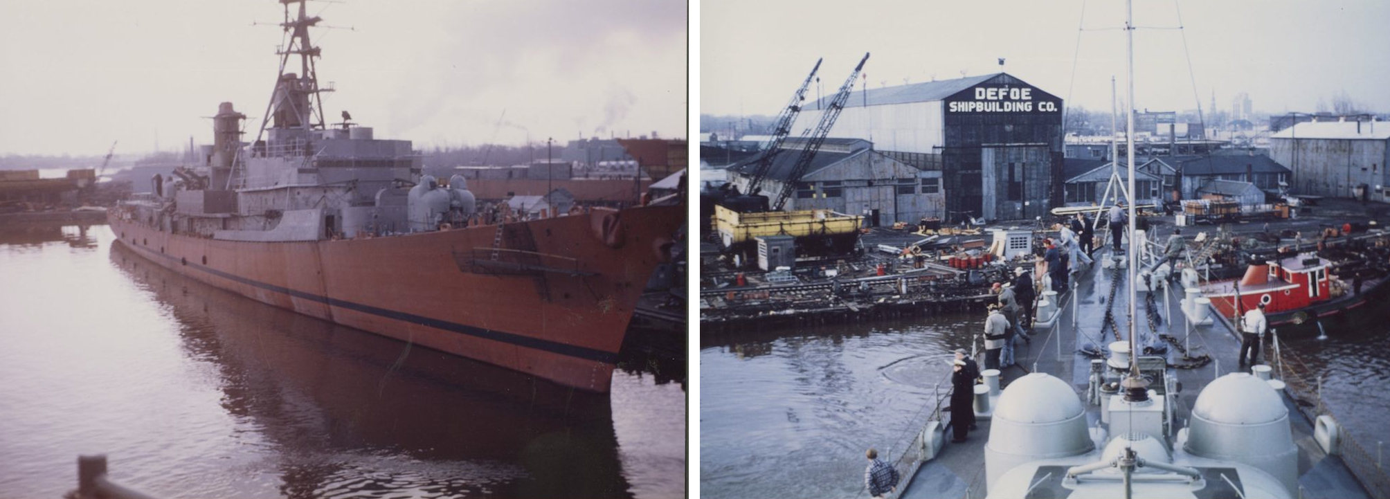 Description: A boat docked in a harbor next to a large ship in the water and a smaller boat in the water.