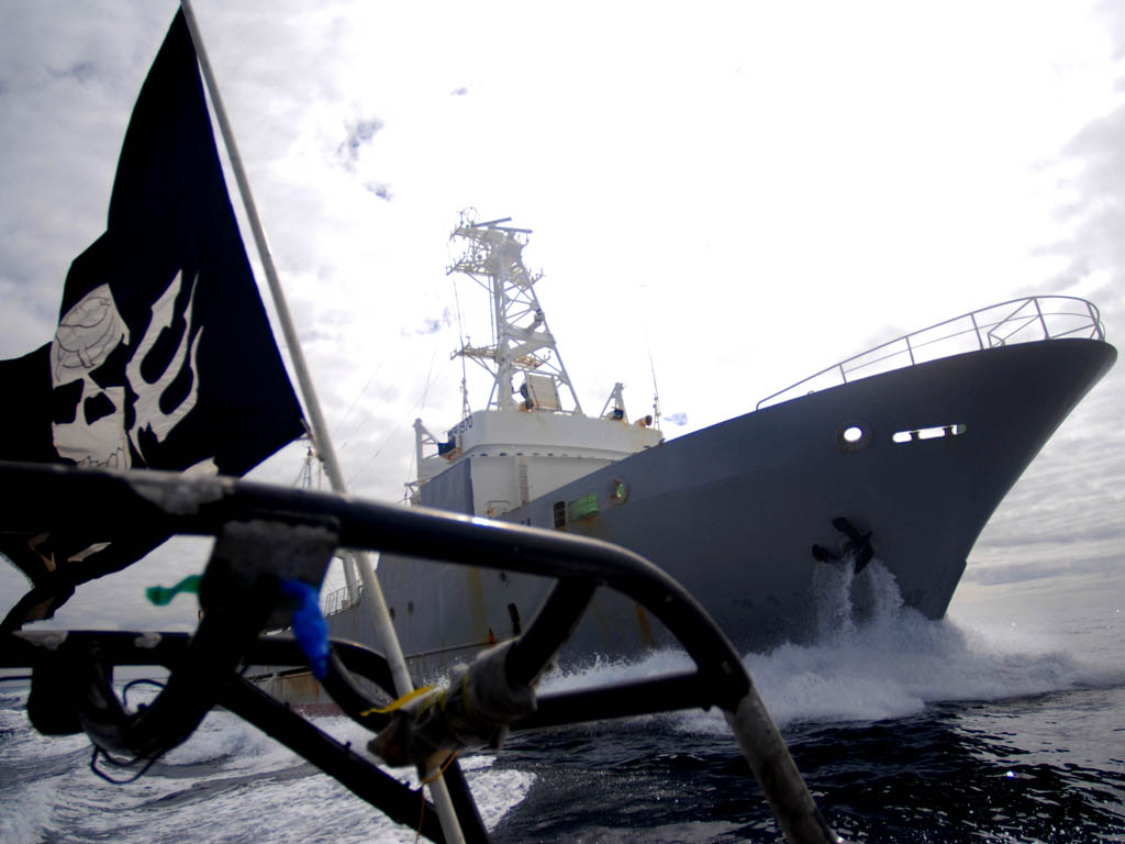 Description: A boat with a flag on it in the water with a sky background and clouds in the background.