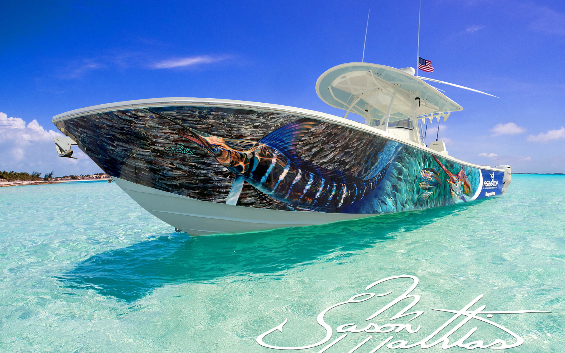 Description: A boat is floating in the clear blue water of the ocean with a flag on it's side.