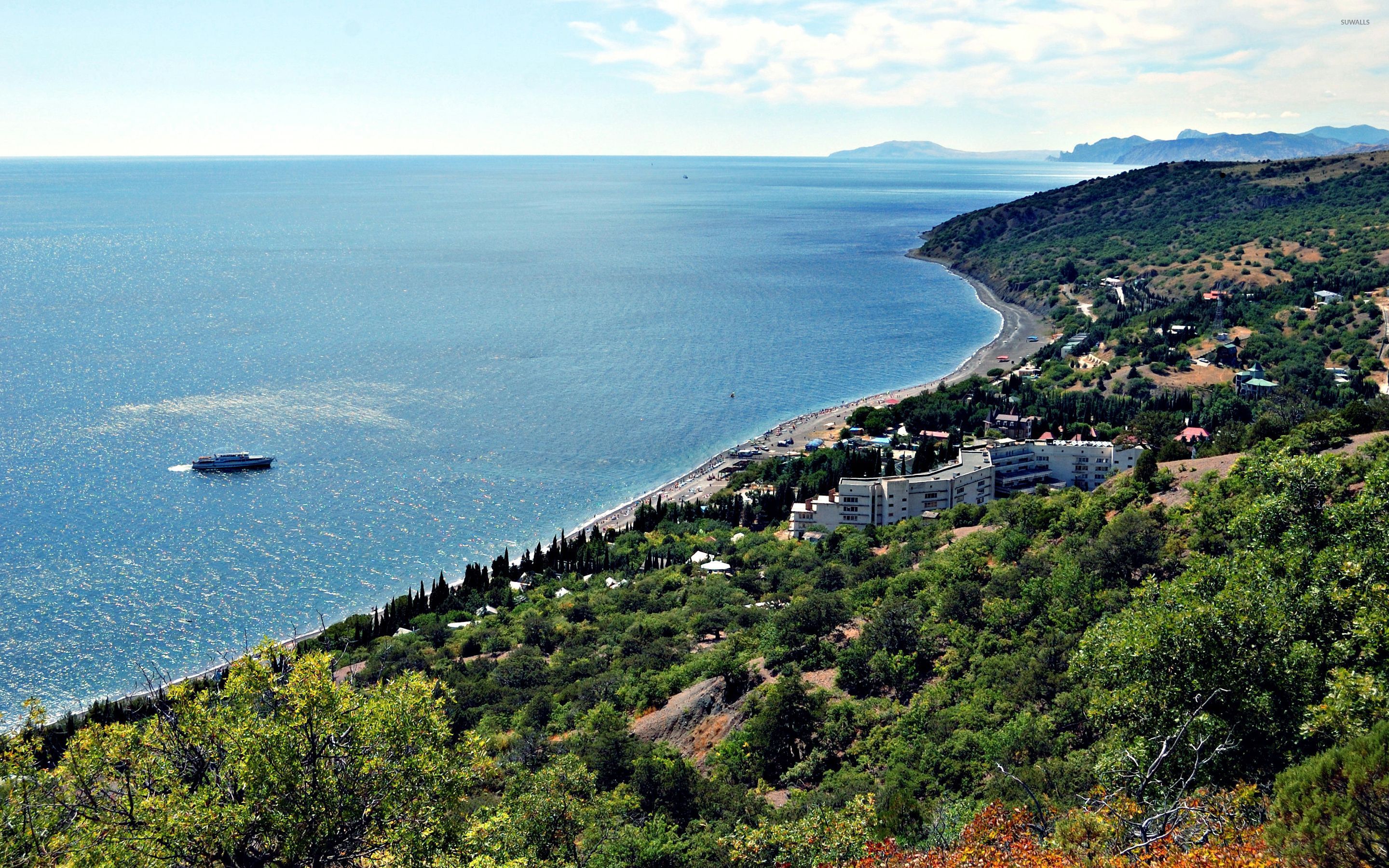 Description: A boat is in the water near a hill side town and a beach with trees and bushes on the side.