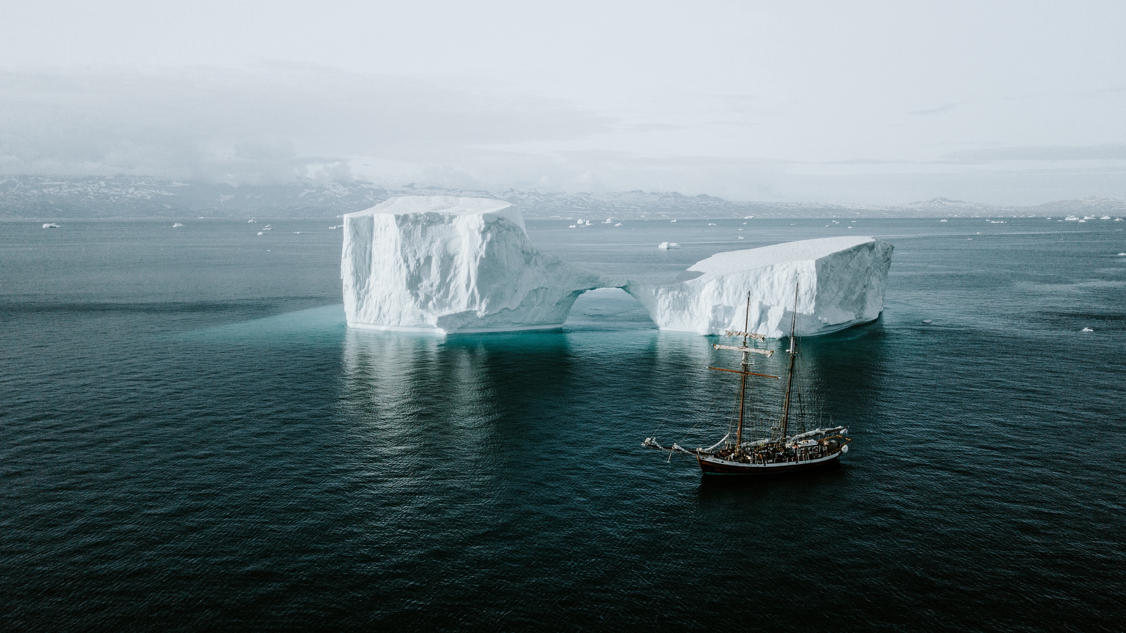 Description: A boat in the water near icebergs in the ocean with a sky background and a large iceberg in the water.