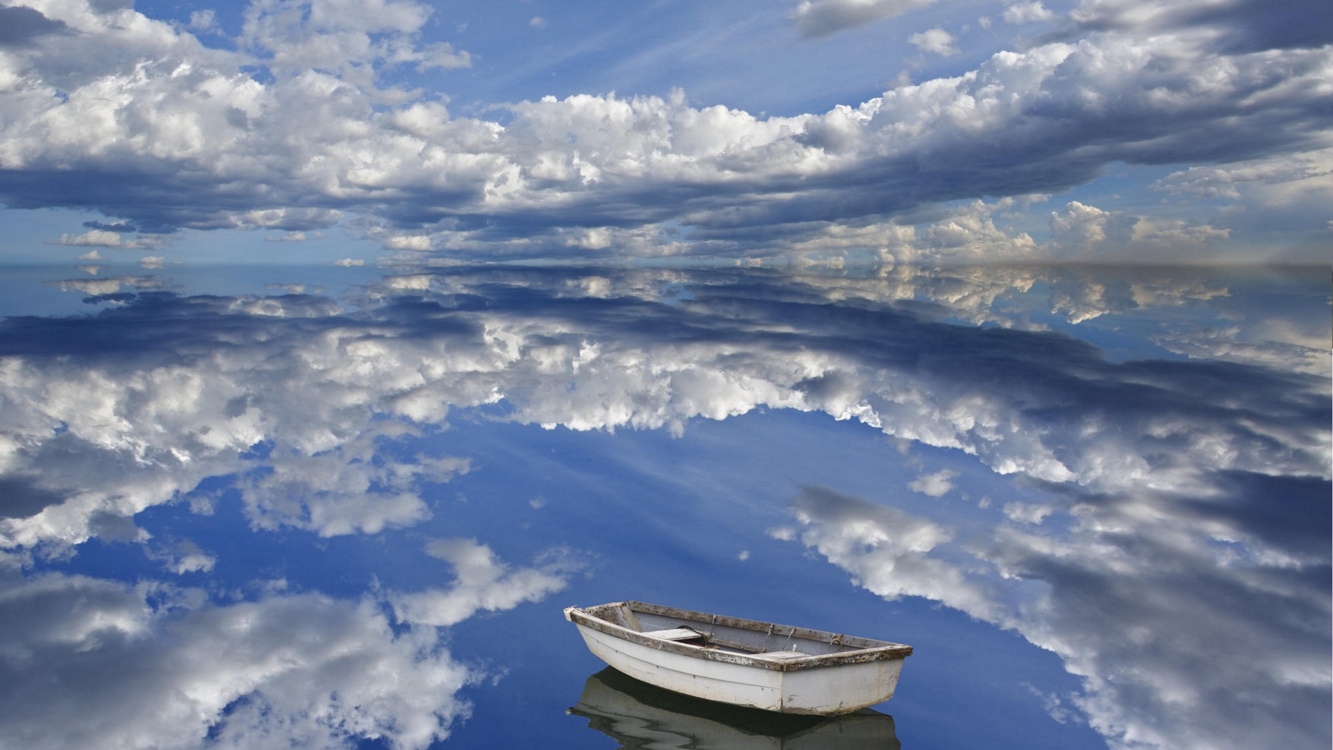 Description: A boat floating on top of a lake under a cloudy sky with clouds in the background and a reflection of the water.