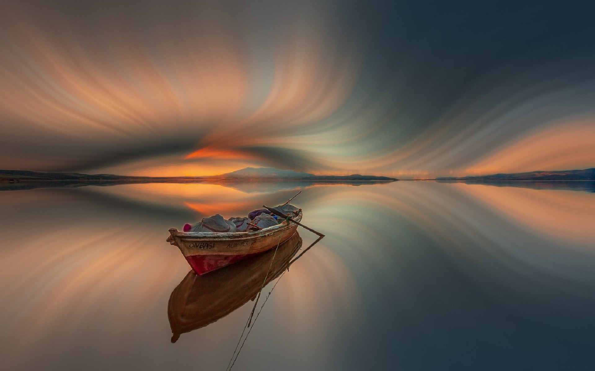 Description: A boat floating on top of a lake under a cloudy sky at sunset with a long exposure of light.