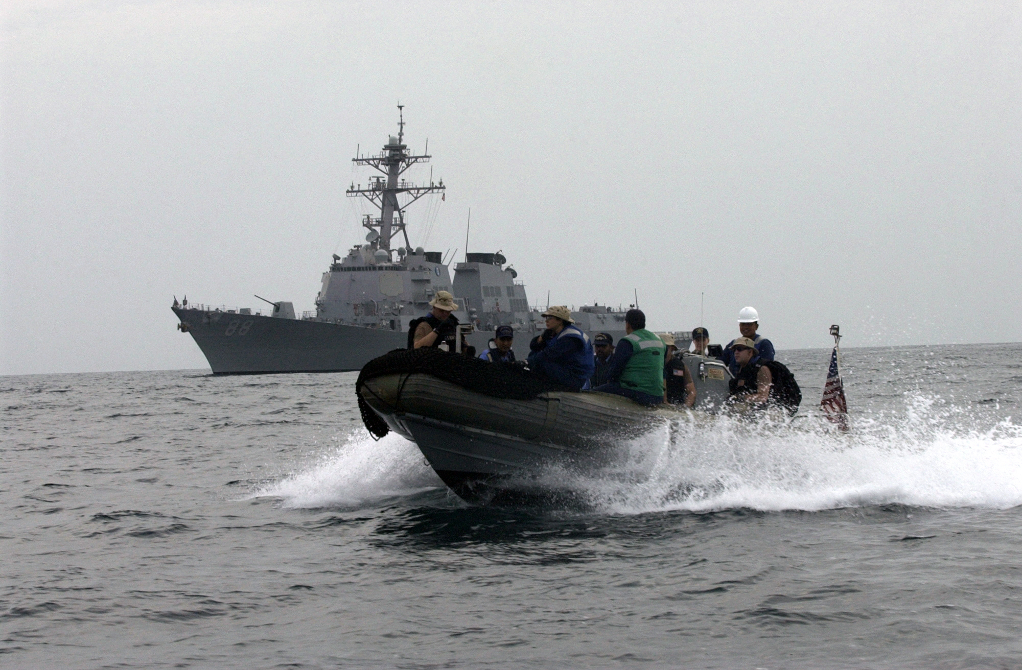 Description: A boat with people on it is in the water near a ship in the ocean with a lot of other boats.