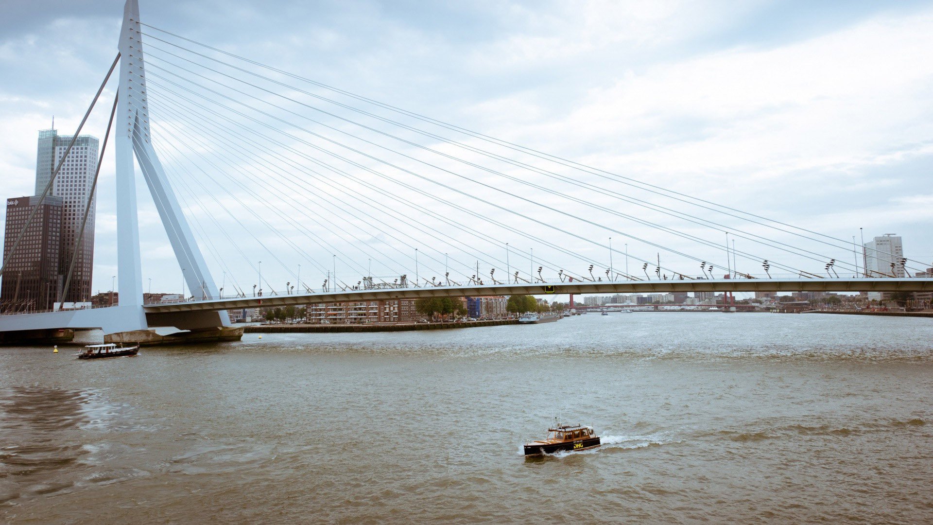 Description: A boat is traveling down the river under a bridge with a tall building in the background and a cloudy sky.