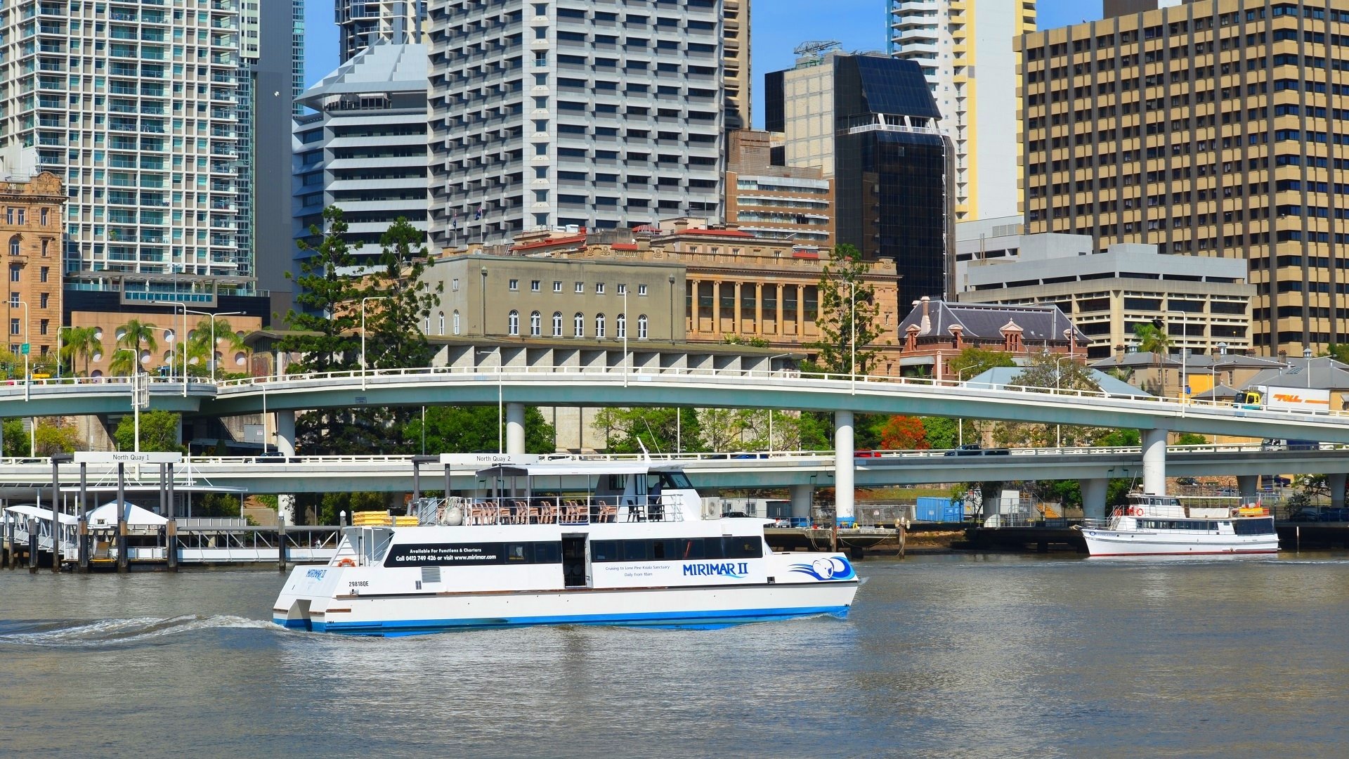Description: A boat traveling down a river next to a city skyline with tall buildings in the background and a bridge over the water.