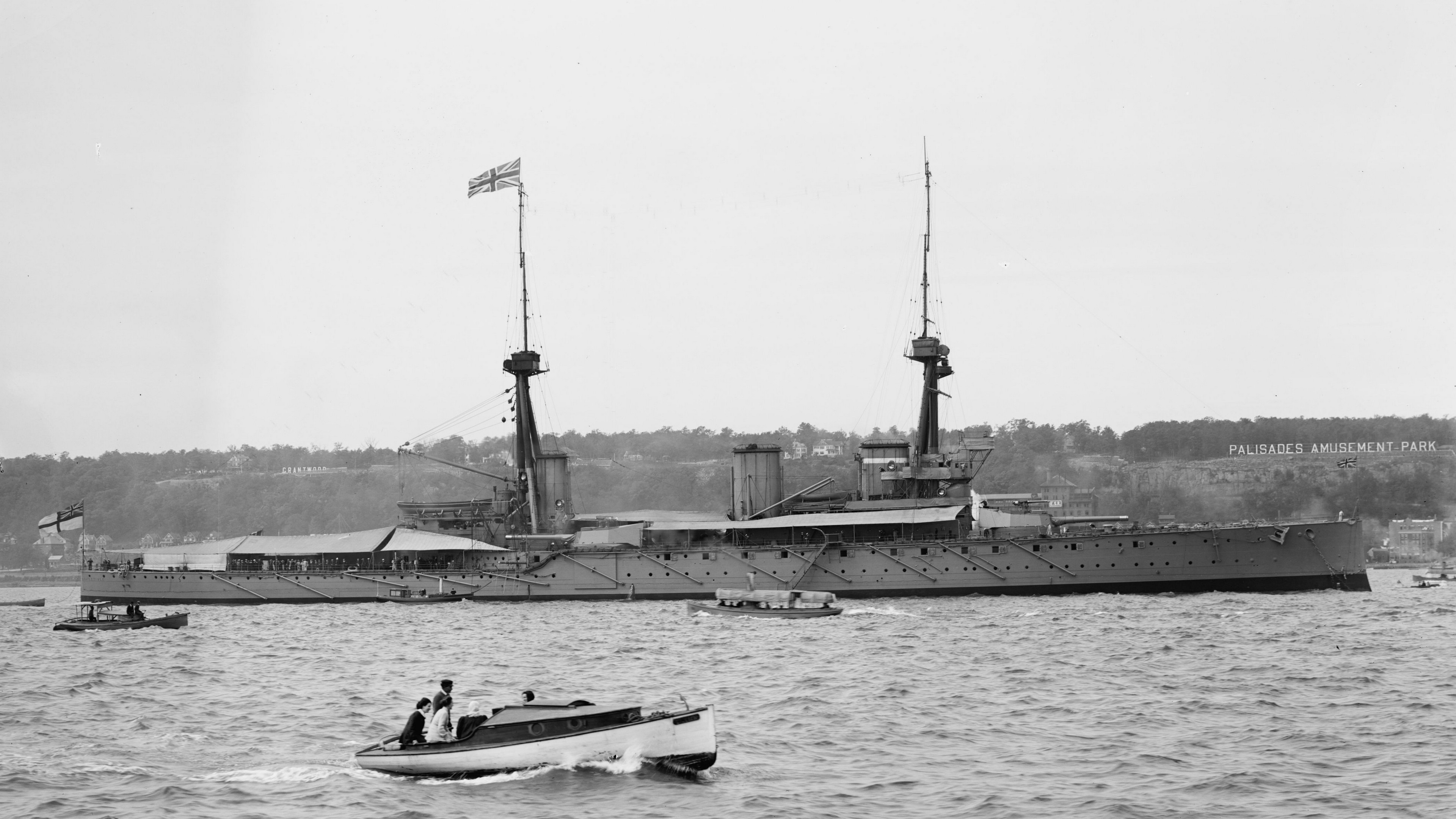 Description: A boat is in the water near a large ship in the water with a flag on it's mast.