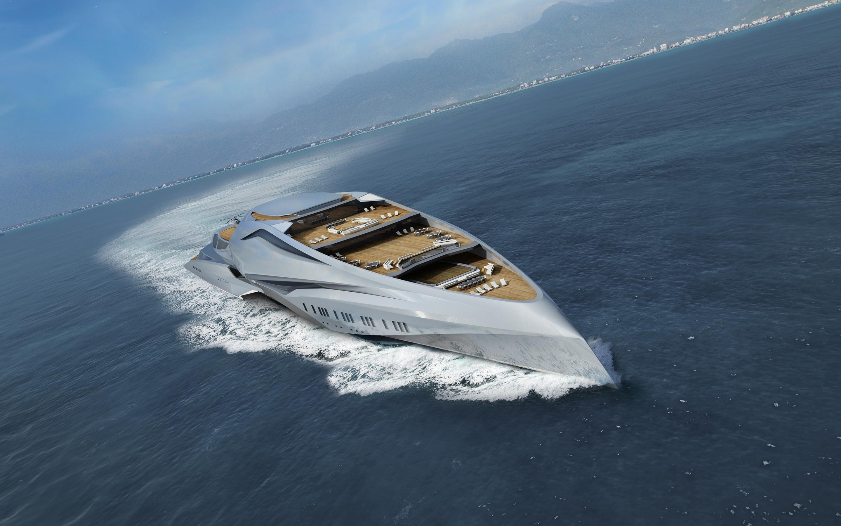 Description: A boat is traveling on the water near a shore line with mountains in the background and a blue sky.
