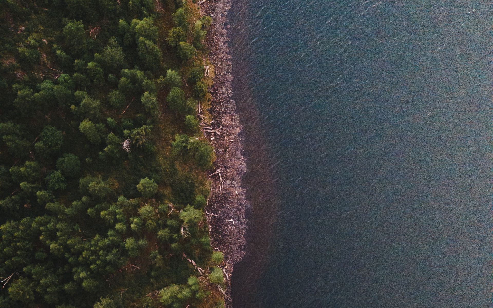 Description: A boat is on the water near a shore line with trees and a boat in the water near a shore line.