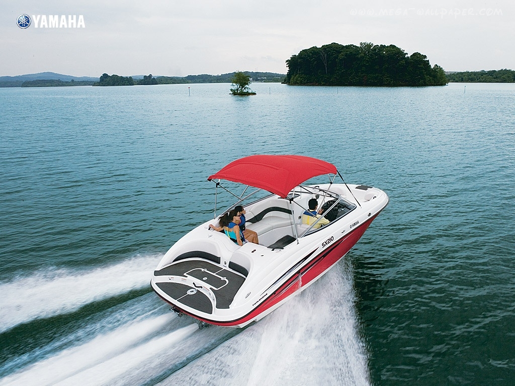Description: A boat is speeding across the water with a red umbrella on top of it's roof and a person in a blue shirt.