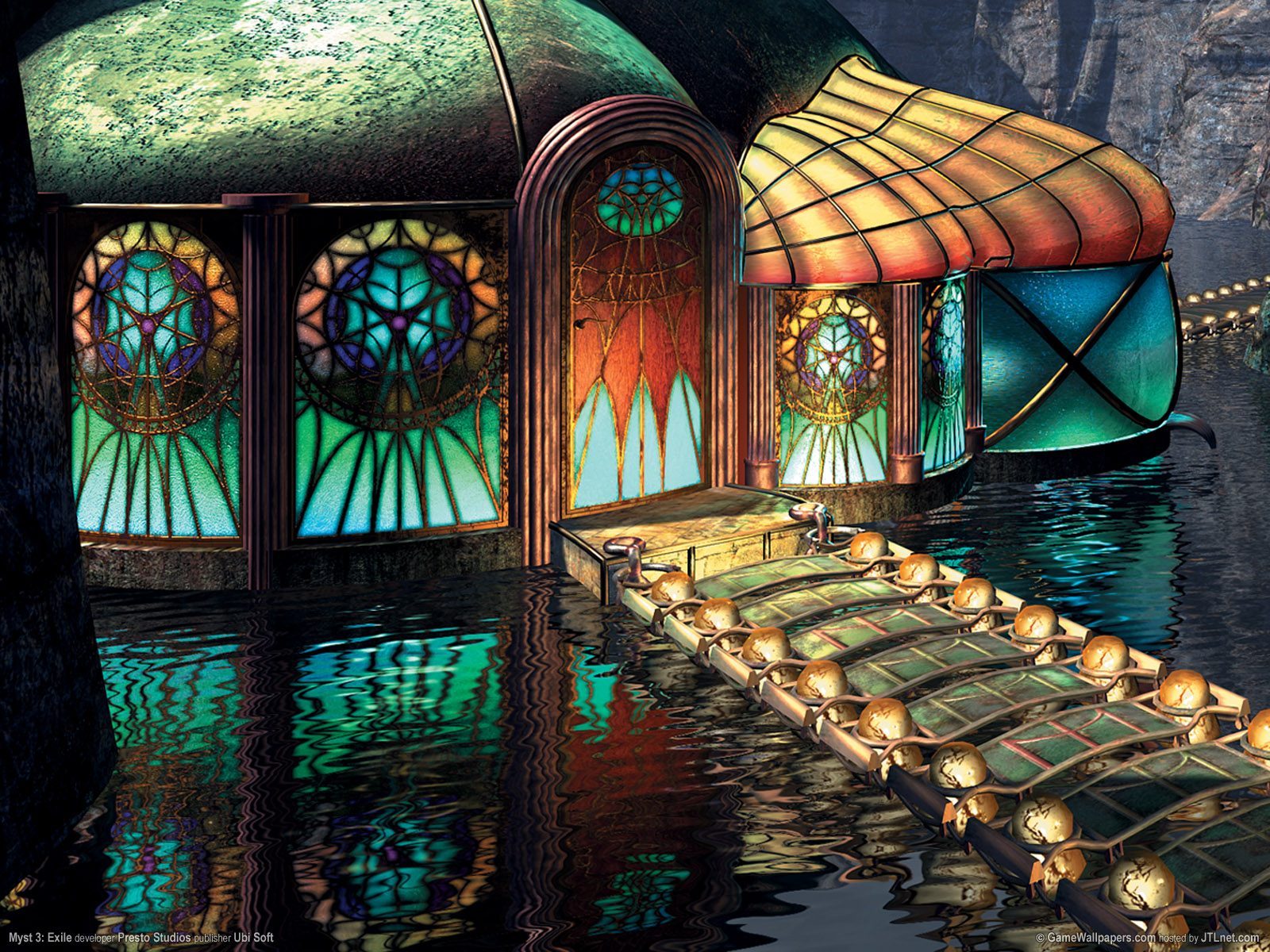 Description: A painting of a boat with a stained glass window and a dock with lights on it and a bridge leading to a cave.