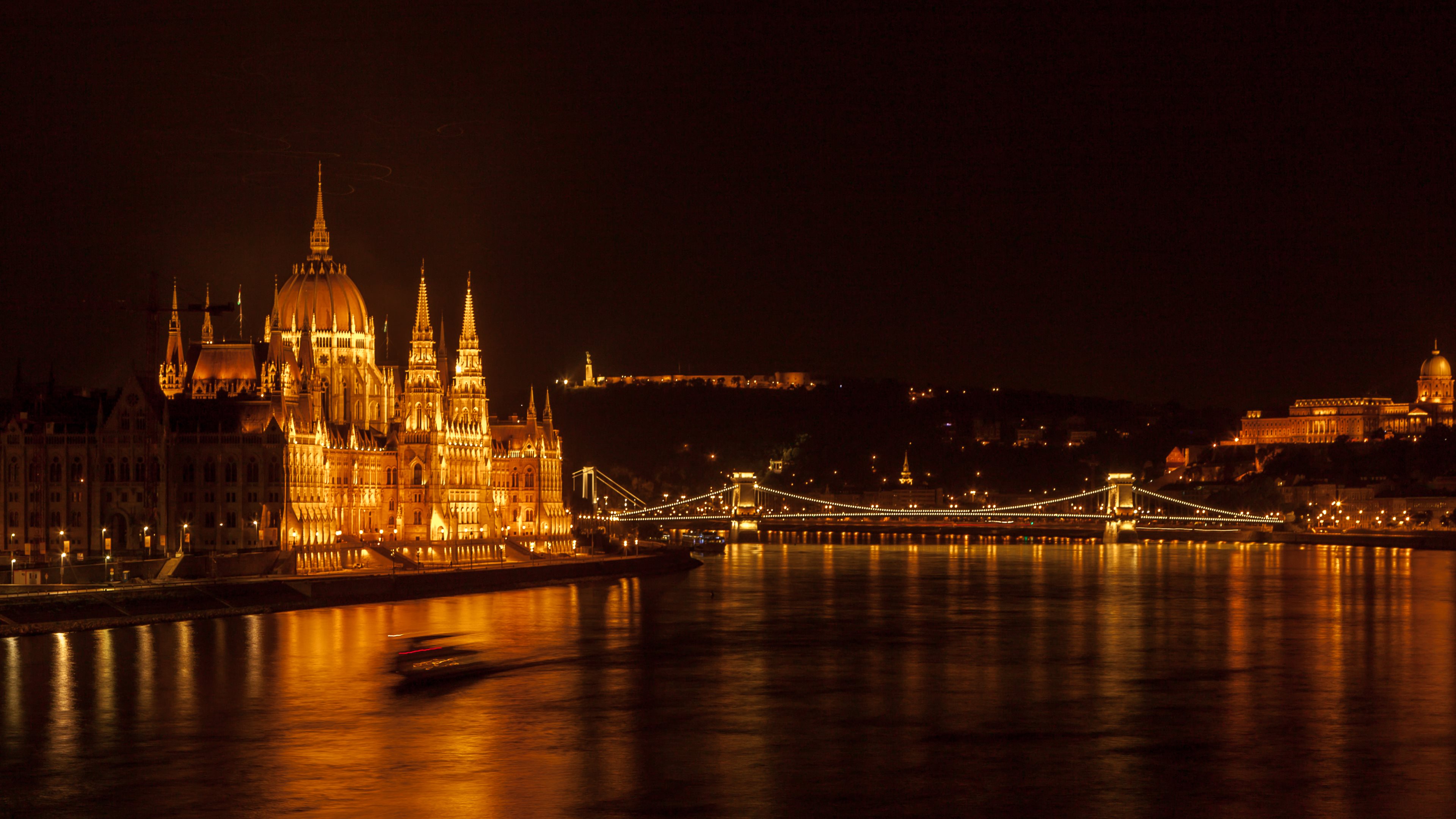 Description: A boat is in the water near a large building at night time with a bridge in the background and a boat in the foreground.