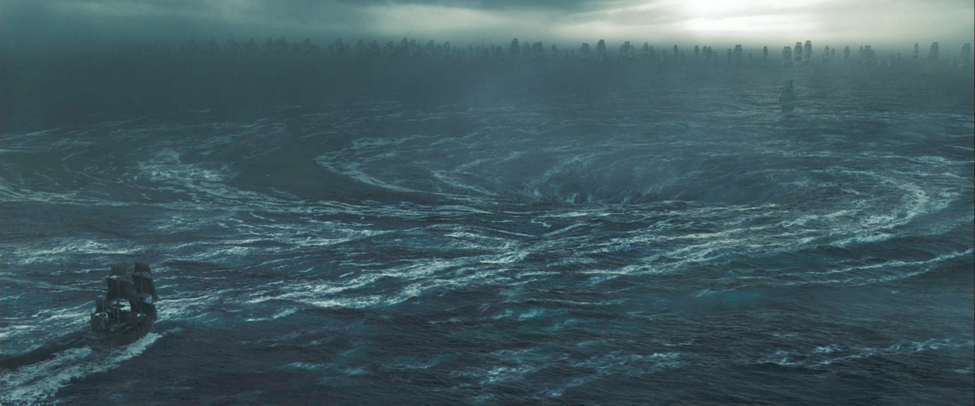 Description: A boat in a large body of water under a cloudy sky with a forest in the background and a boat in the water.