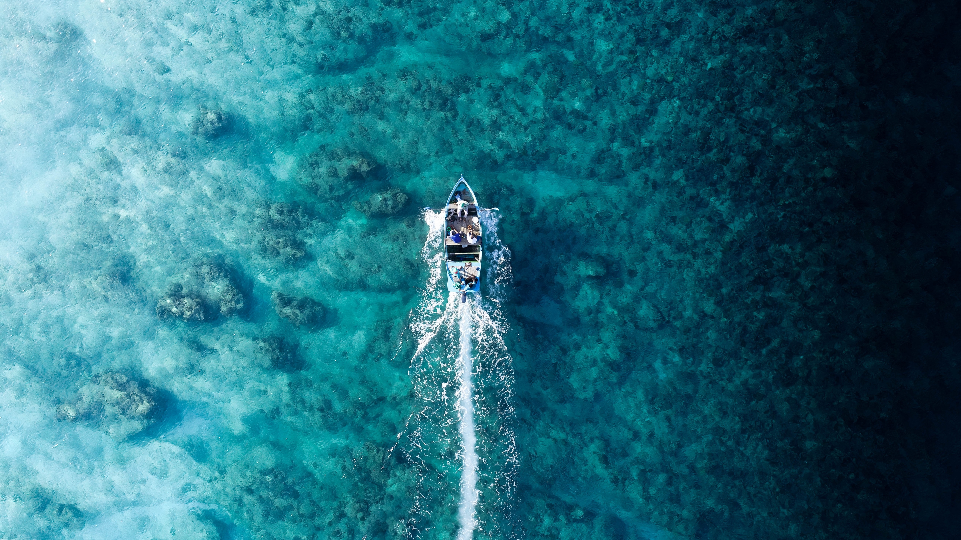 Description: A boat is traveling through the water near the shore of a beach with rocks and corals on the shore.