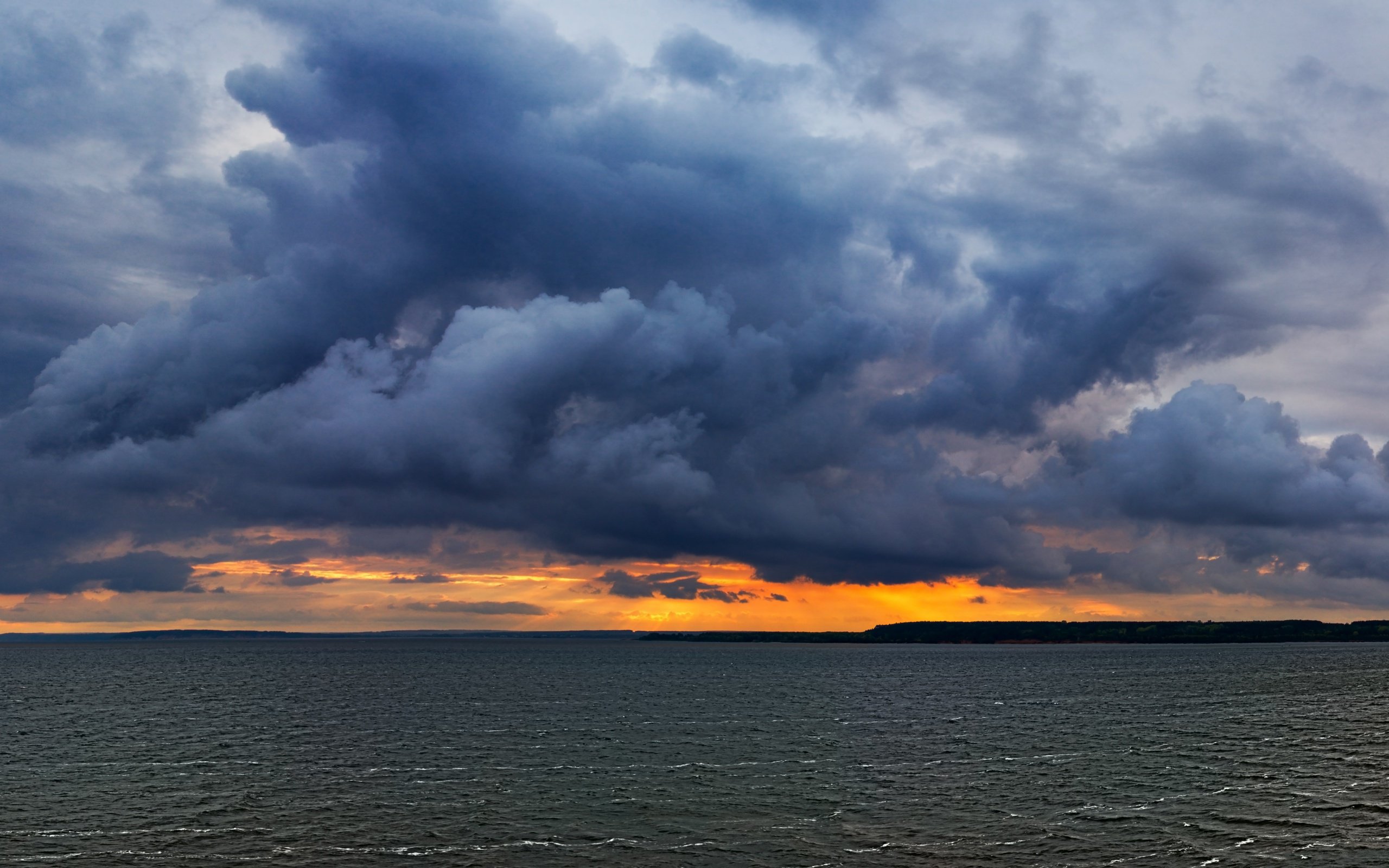 Description: A boat is out on the water under a cloudy sky with a sunset in the background and a boat in the foreground.