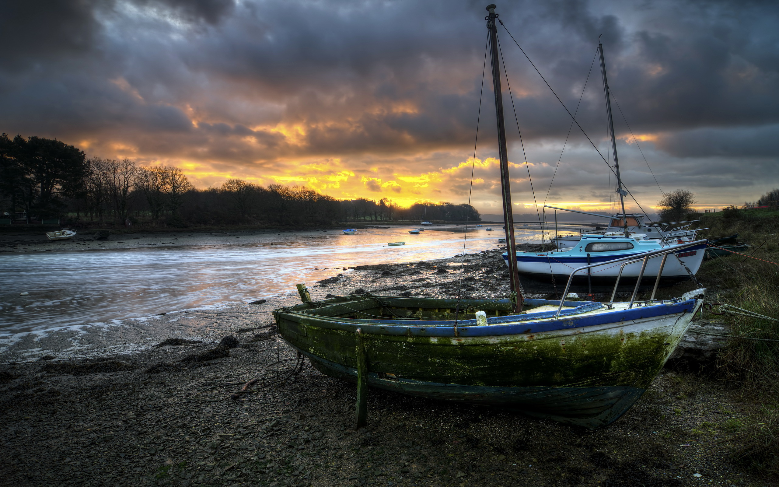 Description: A couple of boats sitting on top of a beach next to a river under a cloudy sky with a sun setting.