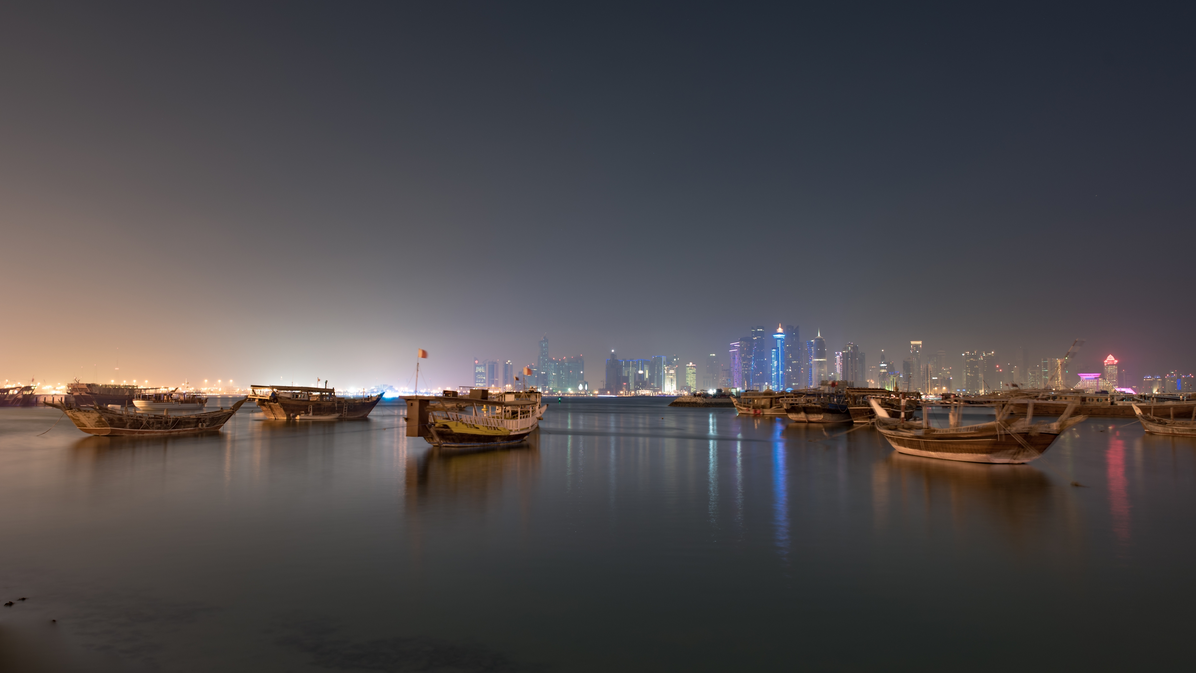 Description: A group of boats floating on top of a lake next to a city skyline at night time with lights on.