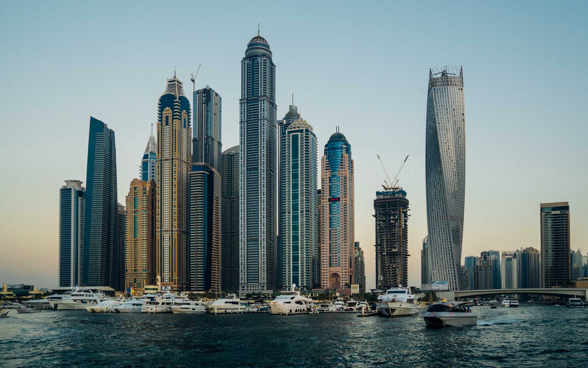 Description: A group of boats floating in front of a large city skyline with tall buildings in the background and a bridge in the foreground.