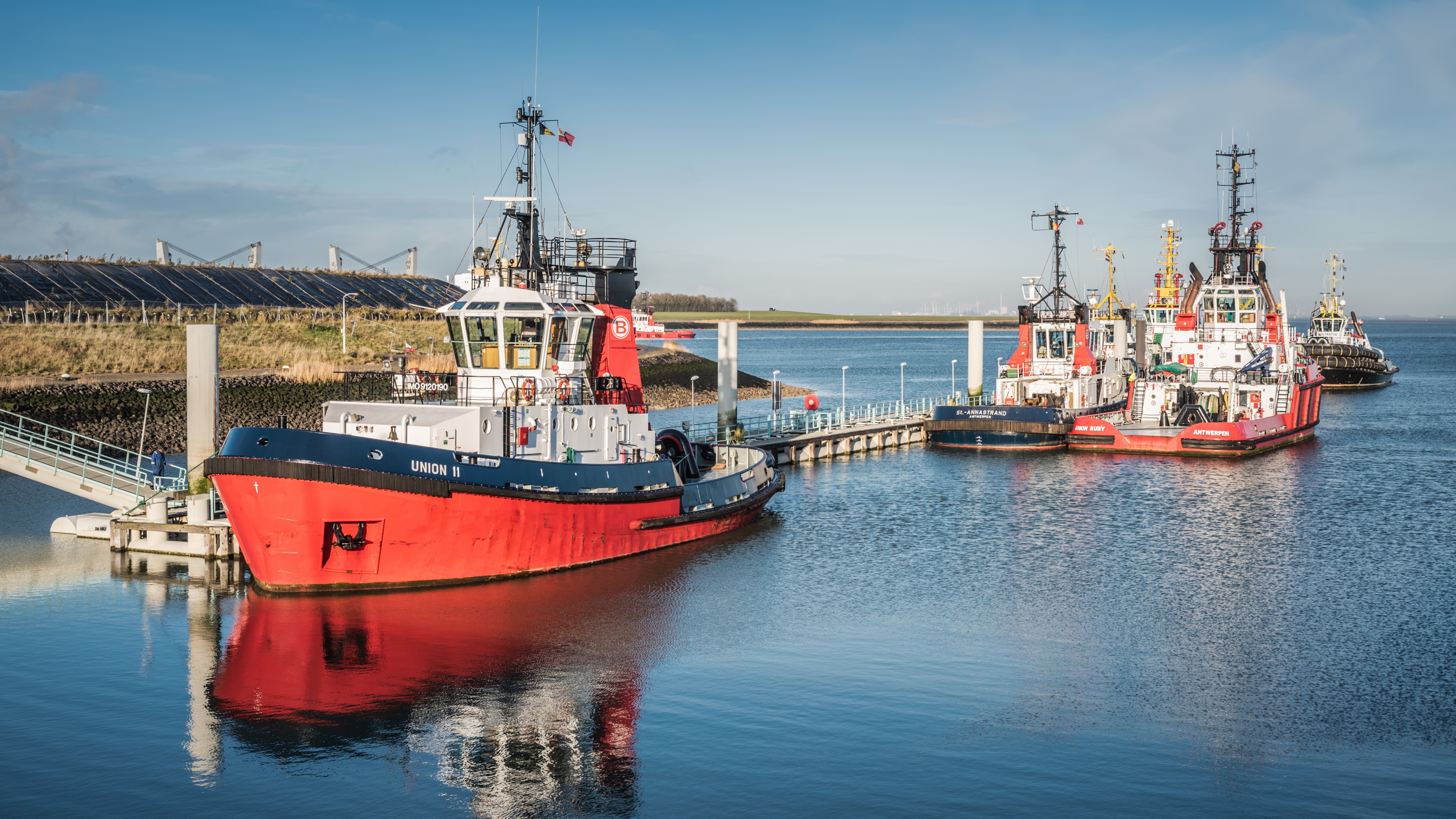 Description: A group of boats docked at a pier on a lake or river with a bridge in the background and a few boats in the water.